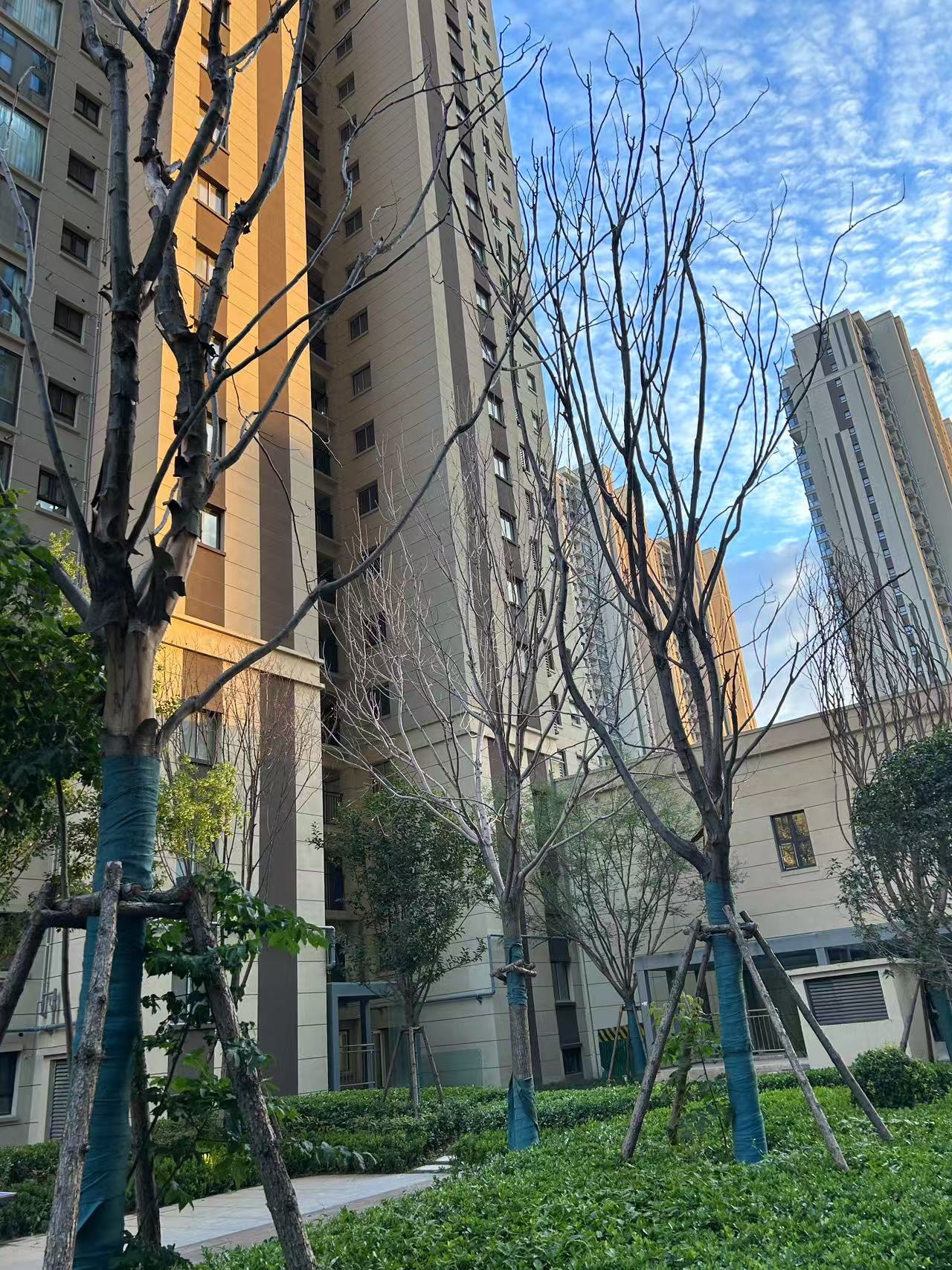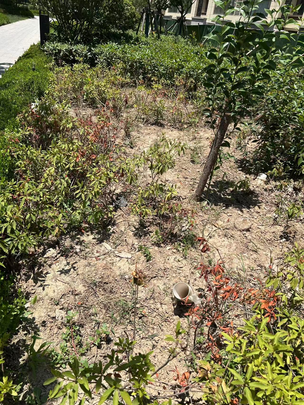 二期南区绿化现状恶劣:苗木枯死,花箱长期空置无苗木,绿化区域完全处于无人养护状态,植被退化。部分灌木枯死之后,开发商没有按照原状进行补种恢复,反而将灌木拔掉,随意种上几棵草来敷衍了事,此外,小区洋房一楼业主违规圈占公共绿化区域作为私人花园,设置多处围挡,导致围挡覆盖区域绿化被损毁。