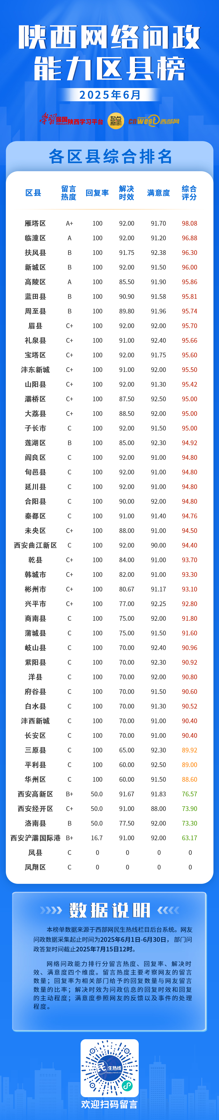 2025年6月,西部网民生热线与陕西45个区县(开发区)进行了网络问政沟通对接。根据各区县(开发区)留言热度、回复情况和网友满意度的综合评定,西安雁塔区、西安临潼区、宝鸡扶风县分别以总分98.08、96.88、96.30位列网络问政能力6月区县榜前三名。