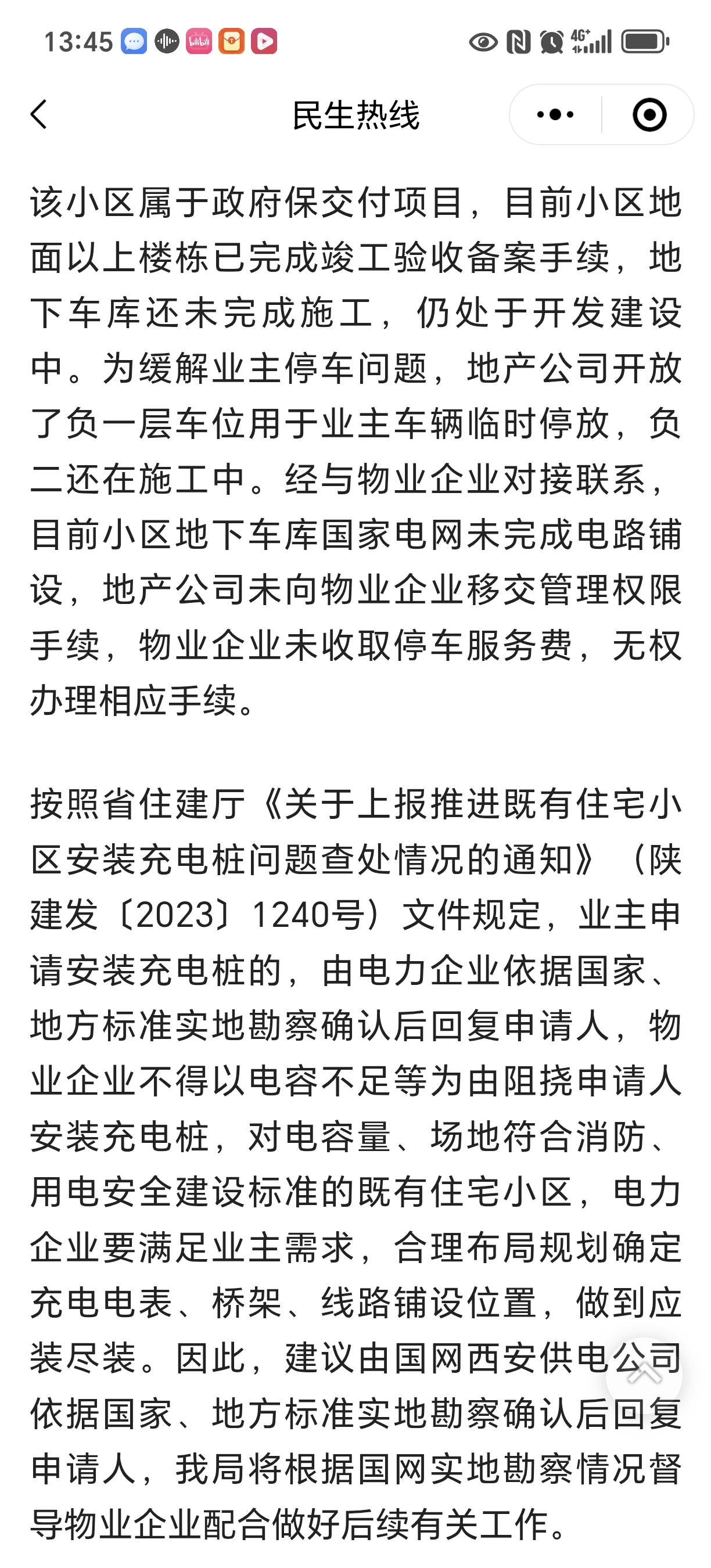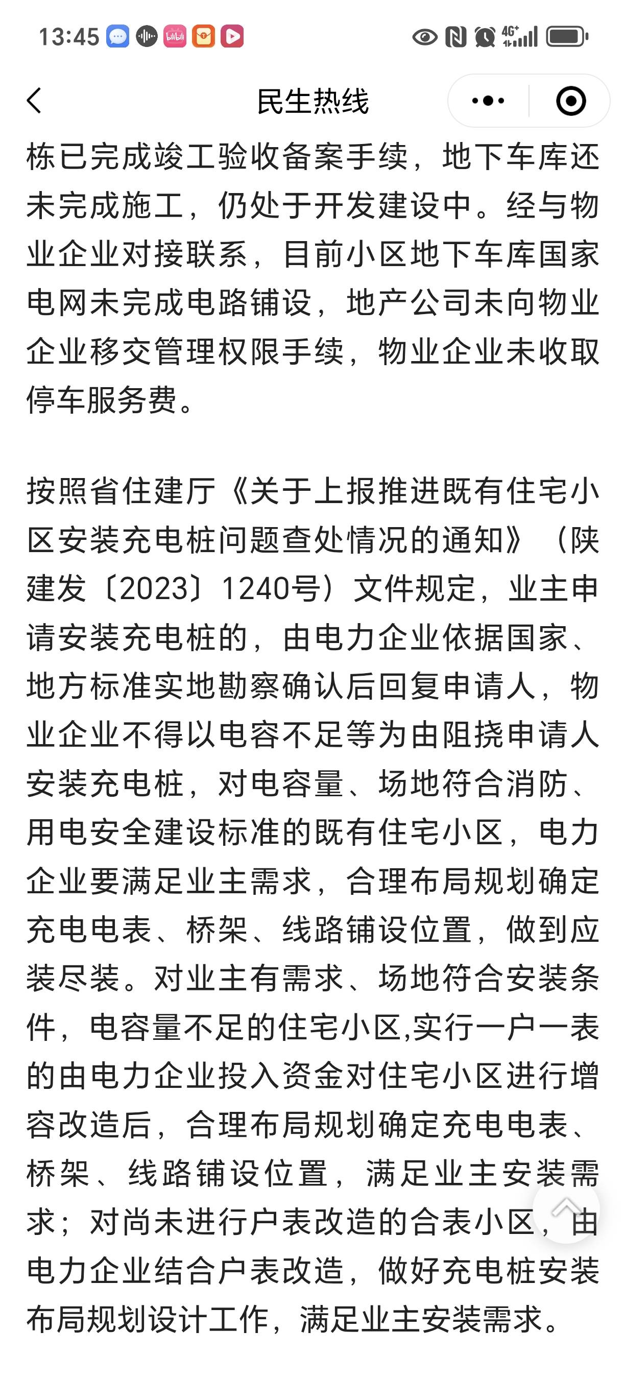 融创宸阅和鸣小区自2024年5月交付至今,车库一直不安装配电箱、电缆等充电桩配套设施。我通过西部网民生热线三次反映(2025年4月、2025年6月、2025年8月),均没有效果,甚至未启动地下车库充电桩配套设施建设的流程。