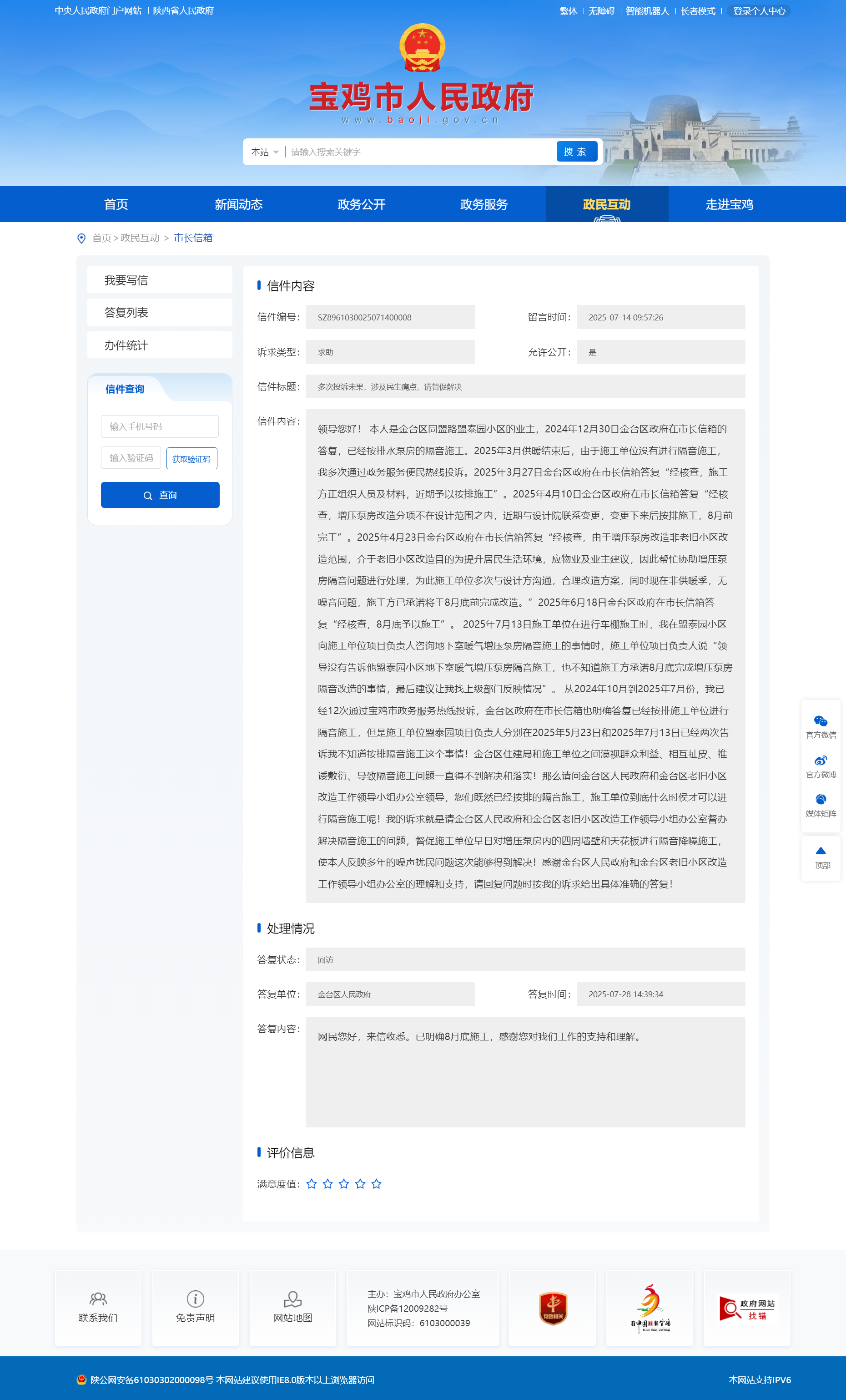 本人是宝鸡市金台区同盟路盟泰园小区的业主,2024年12月30日金台区有关部门答复“已经按排水泵房的隔音施工”。2025年3月供暖结束后,由于施工单位没有进行隔音施工,我多次通过政务服务便民热线投诉。2025年3月27日金台区有关部门在市长信箱答复“经核查,施工方正组织人员及材料,近期予以安排施工”。2025年4月10日金台区有关部门在市长信箱答复“经核查,增压泵房改造分项不在设计范围之内,近期与设计院联系变更,变更下来后安排施工,8月前完工”。2025年4月23日金台区有关部门在市长信箱答复“经核查,由于增压泵房改造非老旧小区改造范围,介于老旧小区改造目的为提升居民生活环境,应物业及业主建议,因此帮忙协助增压泵房隔音问题进行处理,为此施工单位多次与设计方沟通,合理改造方案,同时现在非供暖季,无噪音问题,施工方已承诺将于8月底前完成改造。”2025年6月18日金台区有关部门在市长信箱答复“经核查,8月底予以施工”。2025年7月28日金台区政府在市长信箱答复“已明确8月底施工”。(以上回复内容,均有截图为证。)