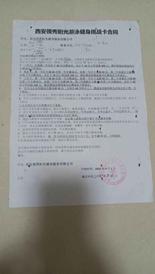 2022年7月在西安领秀阳光健身服务有限公司花费1400元办理了健身挑战卡,于2022年9月1日正式启用。但西安领秀阳光健身服务有限公司于2022年9月4日晚卷款跑路。韦曲派出所于2022年10月受理此案,时至今日仍然没有明确处理结果,被骗资金未退回。期望有关部门关注处理。