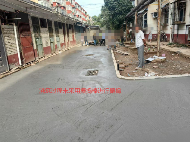 咸阳市沈兴北路建花苑小区正在实施改造工程,混凝土路面浇筑施工时没有对混凝土进行振捣,密实度差,路面基层松软,三轮车都能陷入,希望有关部门及时查处。