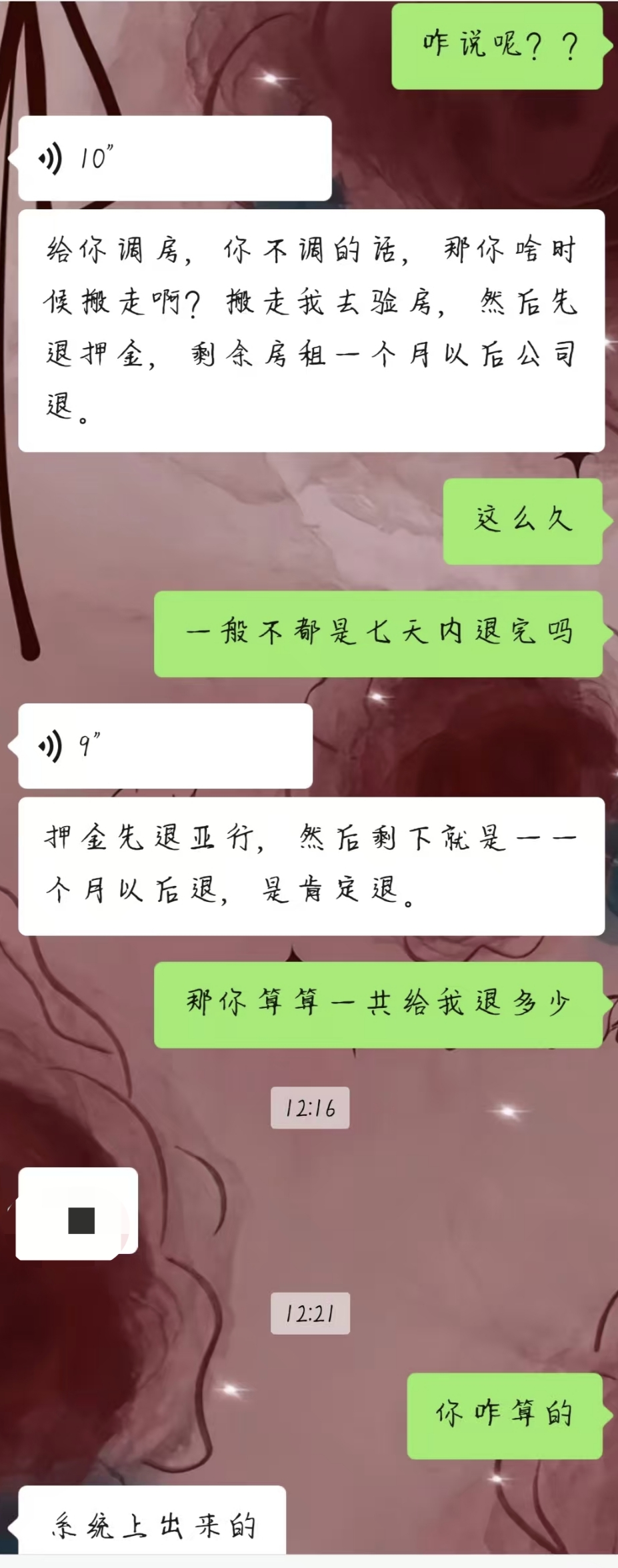 10月8日业主说在9日带新的中介公司看房子,西安鼎信住房租金公司给出的解决方案:1、调房,给出了两个相似的房源,但因离工作地方较远交通不便,我拒绝了,中介说没有其他房源;2、我与中介沟通退租金,中介说只有验房后才能退押金,其余费用在一个月之后退。