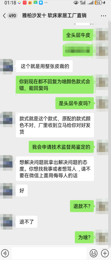 2025年10月10号,我在原点新城雅柏沙发店定制沙发皮墩,和商家约定了款式、颜色及收货时间,商家未按约定时间发货,我收到货后发现款式、颜色都与约定不符,商家承诺皮质是头层牛皮,结果收到货发现皮墩皮质太差,四周是人造革。我联系商家要求退款时被拒,现寻求媒体希望帮助协调退款。