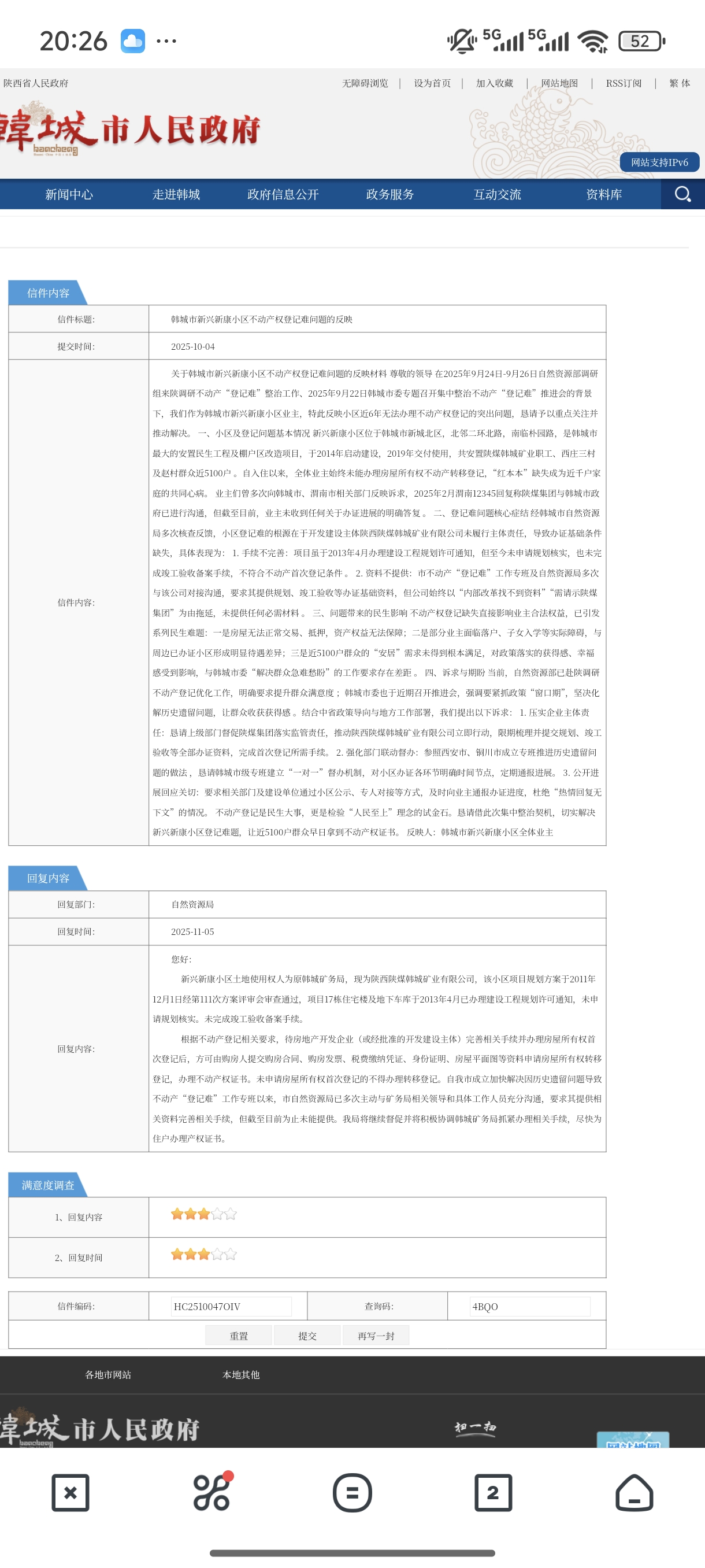 韩城市自然资源局回复:收到贵单位西部网“互联网+督查”问题线索交办单“韩城市新兴新康小区不动产权证办理”问题(韩政督〔2025〕82号)后,我局高度重视,对网友反映的问题进行了认真调查核实。现将办理情况报告如下: