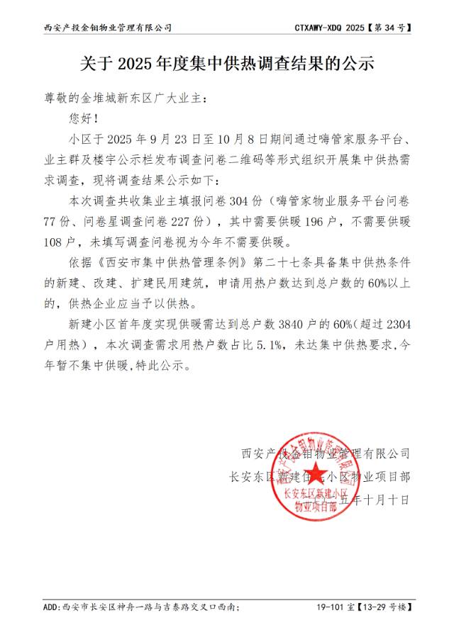 航天区域吉泰路神舟一路金堆城东区新建小区12-16号楼自2021年交房以来不予供暖,群众急盼问题得不到解决,今年西安产投金钼物业公司在微信群发布通知,让需要供暖的业主登记,大多业主并不在群里,且有好多上了年纪的并不会用手机填写需求。物业仅仅凭一个没有实际意义的微信通知就否决了广大业主供暖需求。小区管理混乱,小区分为南北两院,南院今年才交房,现在装修的和北院已入住的混用公共区域,存在一定安全隐患。北院小区入住率高,小孩老人居多,物业不履职,住建部门监管不力,供暖设施已具备为啥不供暖?让业主怎么过冬?