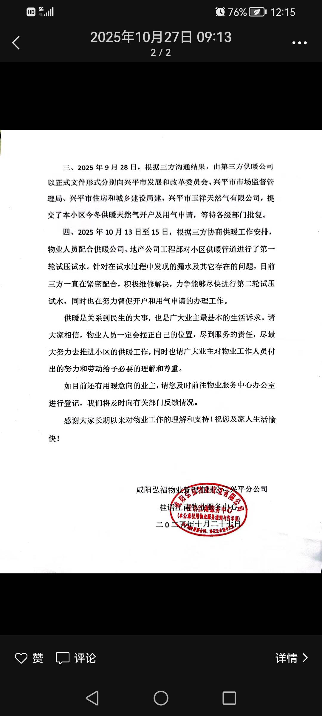 自2022年底交房至今,兴平市绿城桂语江南小区仍未解决,刚开始开发商标准是地热取暖,到最后变成小区自主供暖,合同上是第二个采暖季开始供暖,然而已经三年了,去年因为住户没有达标,今年开始统计都达标了,物业就发了两次文件,通知要打压,至今已经快一个月了没有下文,也不知会业主,有的地方已经开始供暖,而我们小区不知还要忍受多少个寒冬,物业开发商严重不作为,应该积极和业主一起协商解决。小区大多数都是老人小孩,希望有关部门尽快解决。