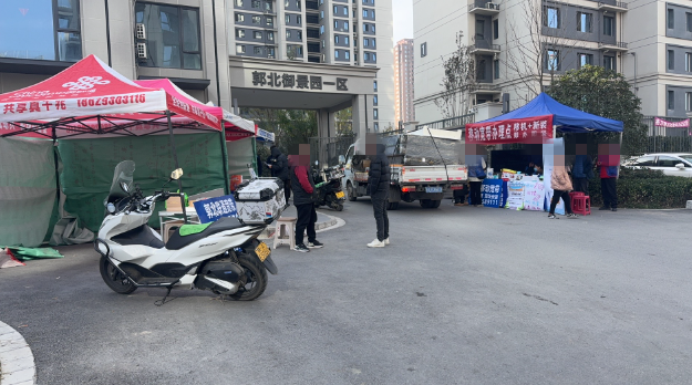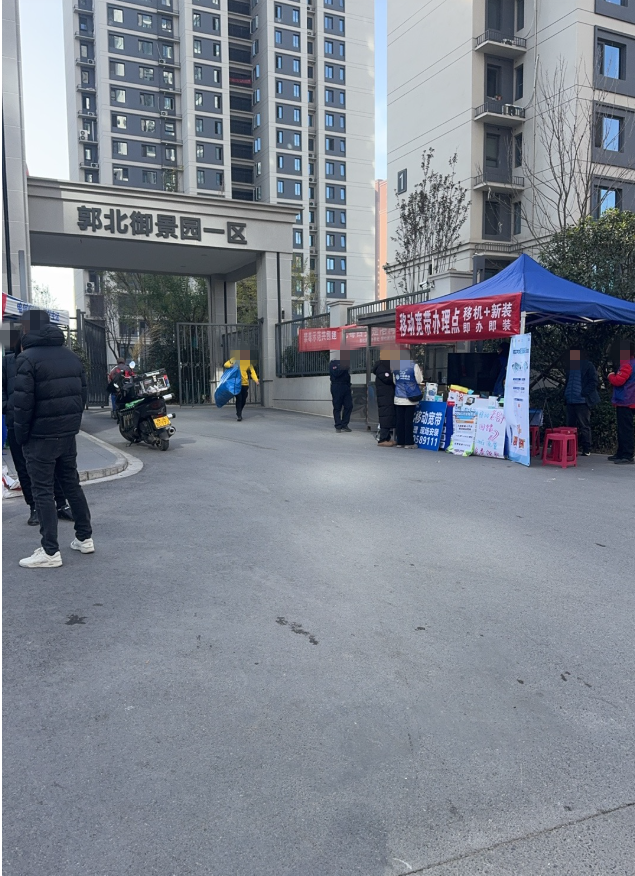 郭北为新回迁社区,宽带安装需求量大,故为方便居民需求允许宽带办理摊位在门口摆摊,现郭北社区已进行协调,已安排摊位至不影响大门正常进出位置,并要求相关工作人员进行协调,妥善引导排队群众不影响大门交通。