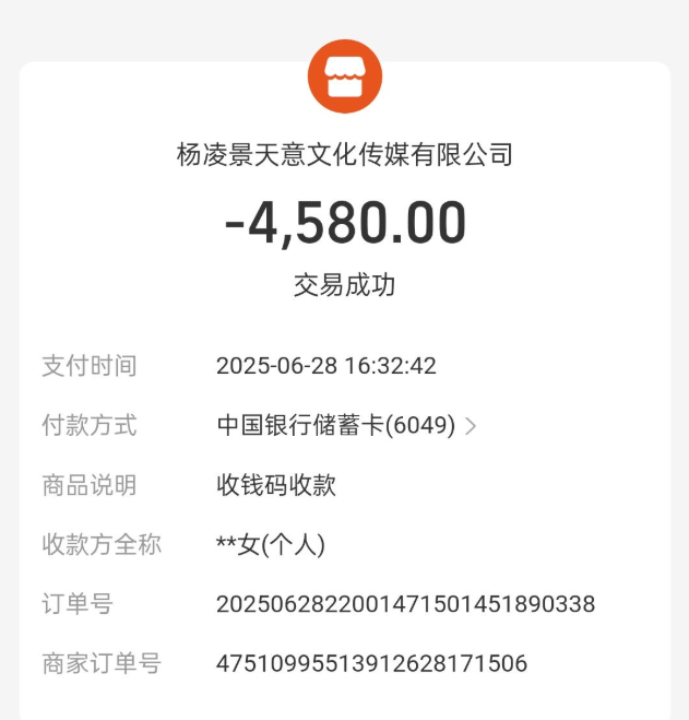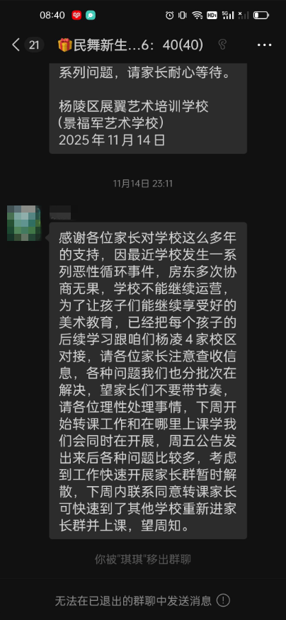 2025年6月28日,我在杨凌展翼艺术培训学校(景福军艺术培训学校)给孩子报民族舞课,缴费4580元,共计96节课,收款公司为杨凌景天意文化传媒有限公司,至10月底断断续续上了10节课左右,店面突然关门。我们家长给相关部门反映无果,目前走投无路,希望给我们尽快处理一下。