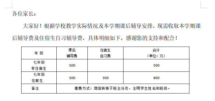 大家好,根据学校教学实际情况及本学期课后辅导安排,现需收取本学期课后辅导费及住宿生自习辅导费,具体明细如下。感谢您的支持和配合[玫瑰]。