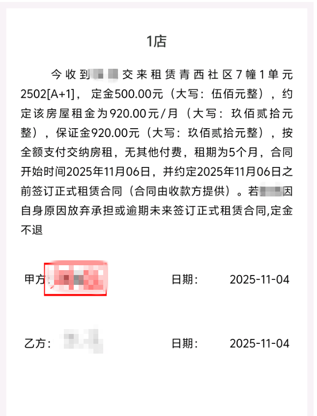 11月4日,我通过我爱人手机向西安安心居住房租赁有限公司工作人员转账500元,作为租赁青西社区7幢1单元2502(A+1)的定金,双方约定2025年11月6日前签订正式租赁合同。由于本人也在青西社区居住,交完定金第二天在小区了解到,该公司名下的7幢1单元2502室租赁纠纷较多,同时该公司工作人员收取定金后开具的电子收据没有公司正规名称和法人签字盖章,抬头不合规。为了避免租住后产生纠纷和不愉快,在未签订正式租赁合同的情况下,11月5日我与该公司工作人员协商不租赁青西社区7幢1单元2502(A+1),遭到拒绝,至今未退还定金500元。