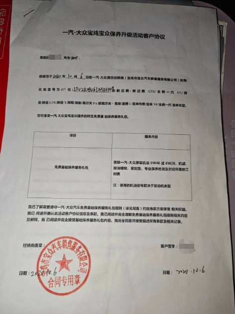 2020年10月,我在一汽大众宝鸡宝众4S店买了汽车终身保养,并签订协议,我只用了首保和自费的四次保养,期间4S店老板换人了,导致我的汽车终身保养不能使用。打电话给前任老板,明确告知我就是不能用。
