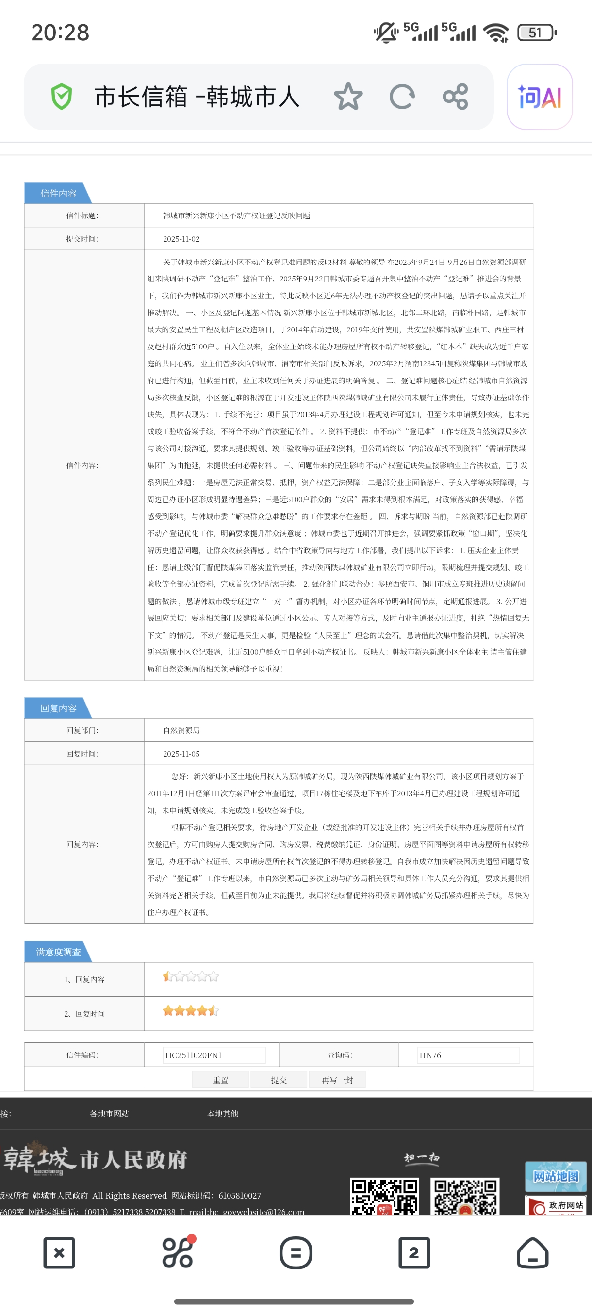 韩城市自然资源局回复:收到贵单位西部网“互联网+督查”问题线索交办单“韩城市新兴新康小区不动产权证办理”问题(韩政督〔2025〕82号)后,我局高度重视,对网友反映的问题进行了认真调查核实。现将办理情况报告如下: