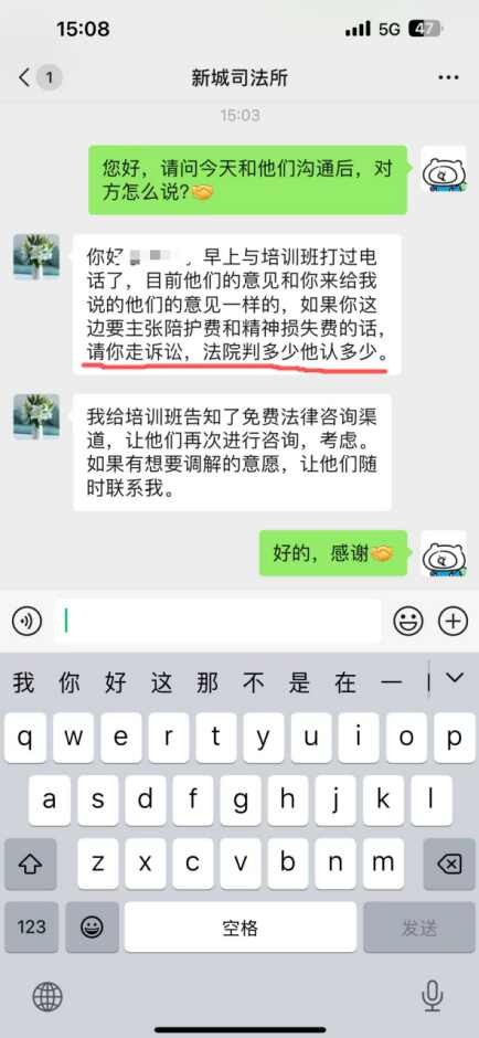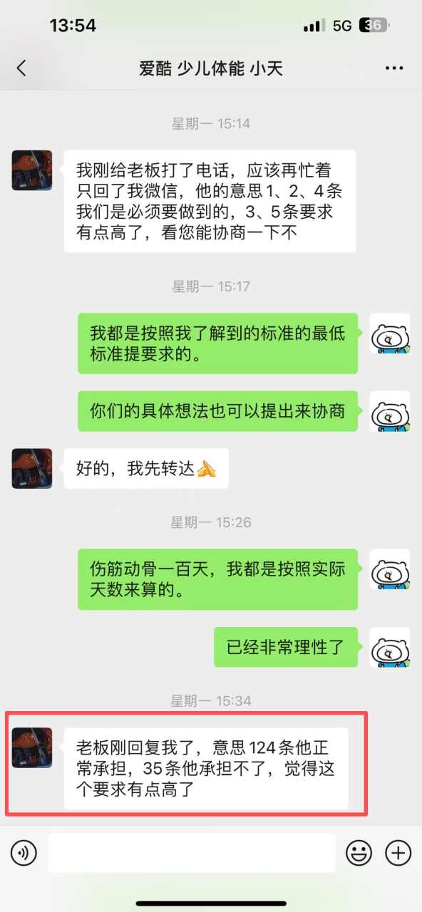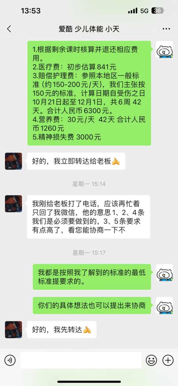 事发后,我们与中心协商。在微信聊天中,对方负责人明确承认了以下责任,并承诺做到:1.退还剩余课时费(承认)。2.赔偿全部医疗费841元(承认)。3.赔偿营养费1260元(承认)。这是聊天记录截图,他们亲口说的“1、2、4条我们是必须要做到的”。