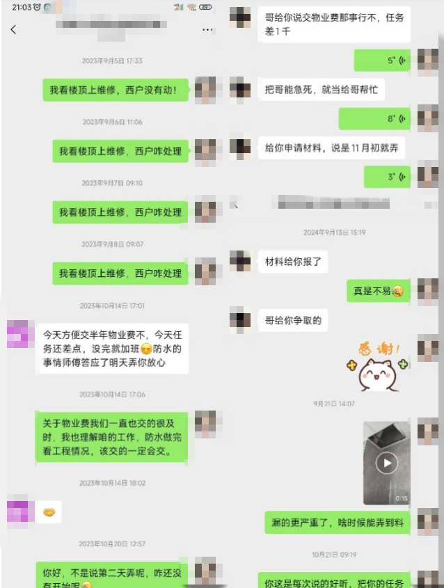 我是香缤国际城紫荆苑二期14号楼二单元业主,2016年拿着东拼西凑借来的血汗钱贷款,买了西安市未央区未央湖街道香缤国际城的房子,本以为能在西安有一处落脚,谁知这却是噩梦的开始。我家是住在顶楼,2017年入住,2020年房屋楼顶出现漏水现象,就跟物业管理处报修,就不管。2023年9月起,导致卫生间、客厅、餐厅、三个卧室等顶角墙面起水珠、有霉斑生长。漏水频率高,雨季尤为严重,已多次使用盆接水。渗水问题严重影响了我的日常生活和居住环境,这两年多来,向物业管理处提出了无数次维修请求,期间隔三差五的催,物业公司一直在踢皮球然而至今仍未安排维修。各部门我也都打电话诉说,至今未得到问题的解决,都相互推诿扯皮。物业公司更是以各种理由拒绝处理,要求业主自行承担费用维修。物业工作人员以收物业费任务为由,骗取我交完物业费就无动于衷,玩消失!同住一个小区,漏水问题给别人弄,我家未能解决。