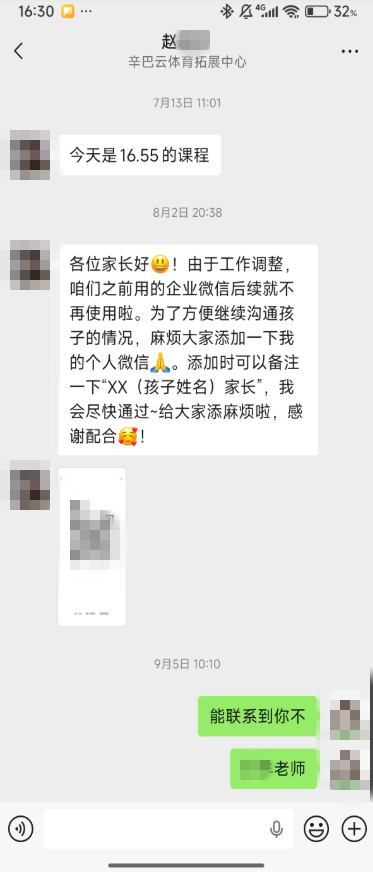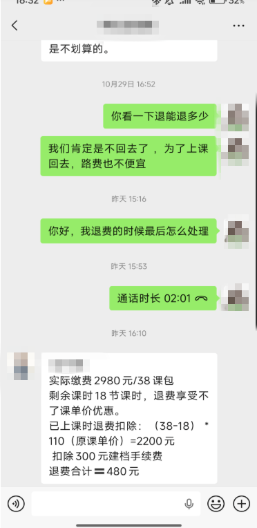 今年1月在渭滨区太阳市辛巴云少儿体能训练馆报少儿体能课38节,共2980元,上课老师为赵老师。截至8月31日共上课20节,剩余18节。9月5日联系赵老师约课,无回复。9月9日上课换为其他老师,并未提前告知经过我的同意。又因为本人要离开宝鸡,故提出是否可以退课,未果。10月28日再次联系咨询退费,依然未果。12月16日再次联系机构要求退费。历时3个月,这期间机构一直未答复。12月16日,告知退费金额:实际缴费2980元/38课,剩余课时18节课时,退费享受不了课单价优惠。已上课时退费扣除:(38-18) *110(原课单价)=2200元,扣除300元建档手续费,退费合计480元。