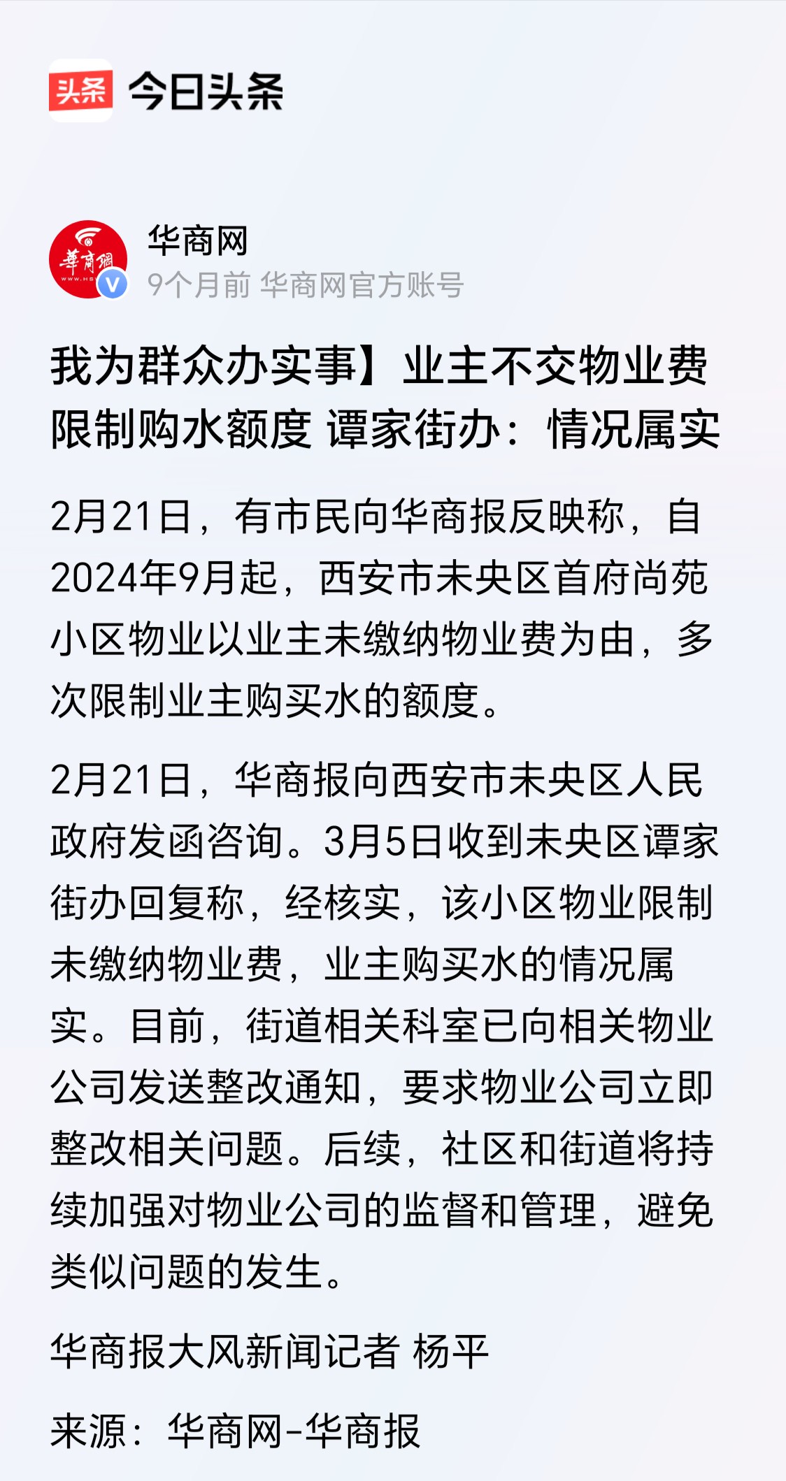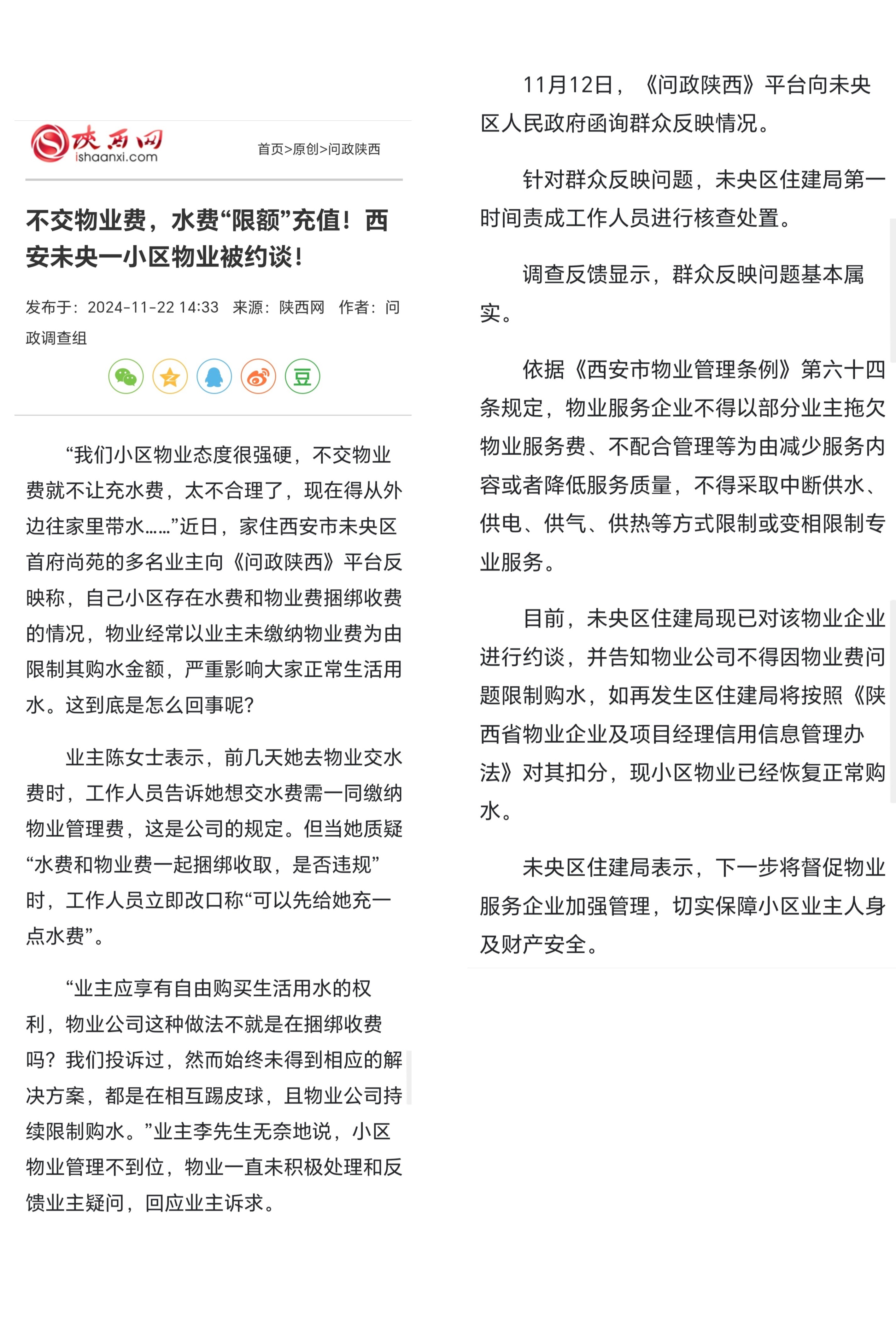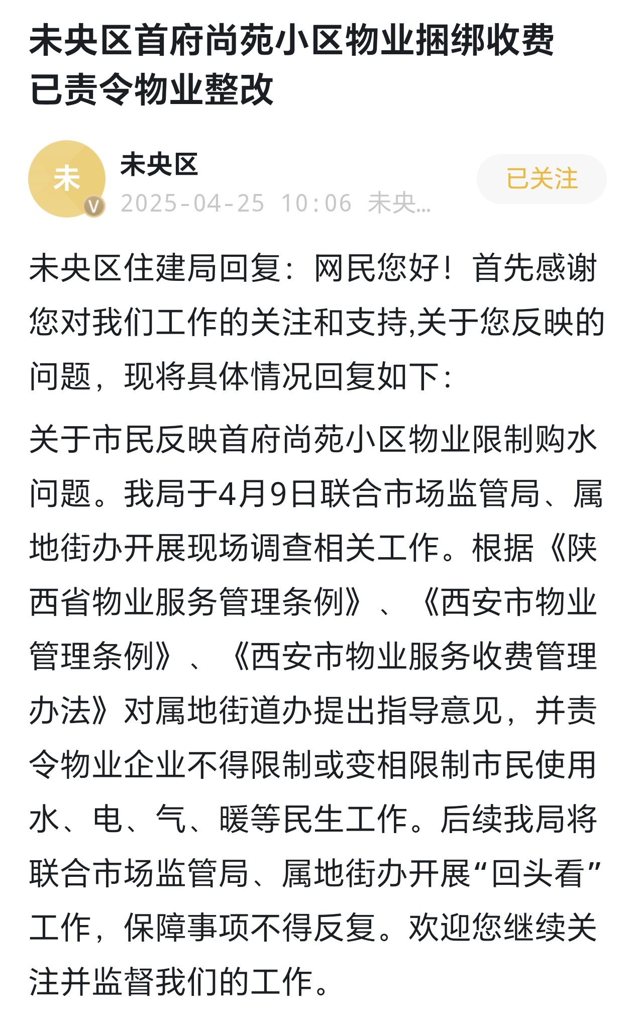 早在2024年9月,该小区物业就因以业主未交物业费为由限制购水额度,被业主们多次投诉。未央区谭家街办核实情况后,向物业下发整改通知;2024年11月,未央区住建局针对此事约谈物业,明确要求其停止限制购水的违规行为,物业当时也恢复了正常购水;2025年4月9日,未央区住建局又联合市场监管局、属地街办开展现场调查,依据《陕西省物业服务管理条例》《西安市物业管理条例》等法规,责令物业不得限制或变相限制业主使用水、电、气、暖等民生服务,并表示将开展“回头看”工作保障问题不反复。