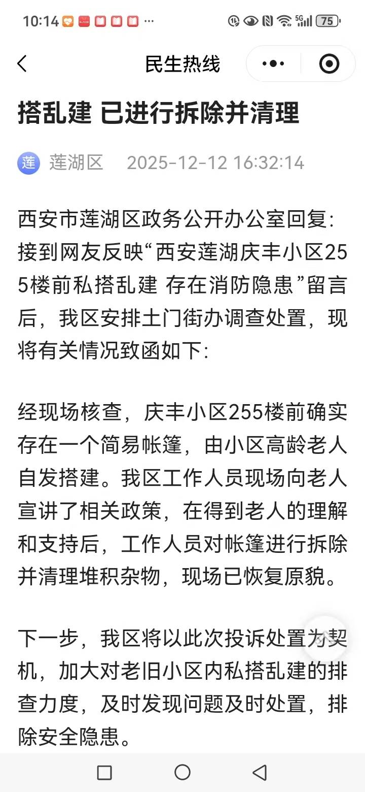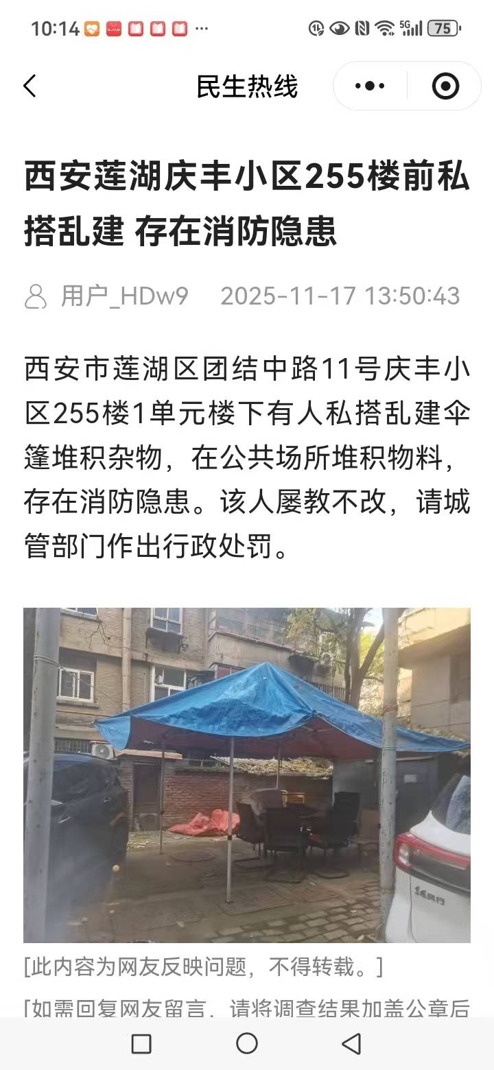 有人长期占用庆丰小区255楼1单元楼下区域,长期堆放桌椅板凳开设麻将摊。依据《陕西省物业服务管理条例》第七十八条第一款、第一百零七条,应该作出行政处罚。该问题曾于2025年11月17日在西部网民生热线栏目反映,土门街办提到“我区将以此次投诉处置为契机,加大对老旧小区内私搭乱建的排查力度,及时发现问题及时处置,排除安全隐患。”但截至目前,该问题仍未解决。