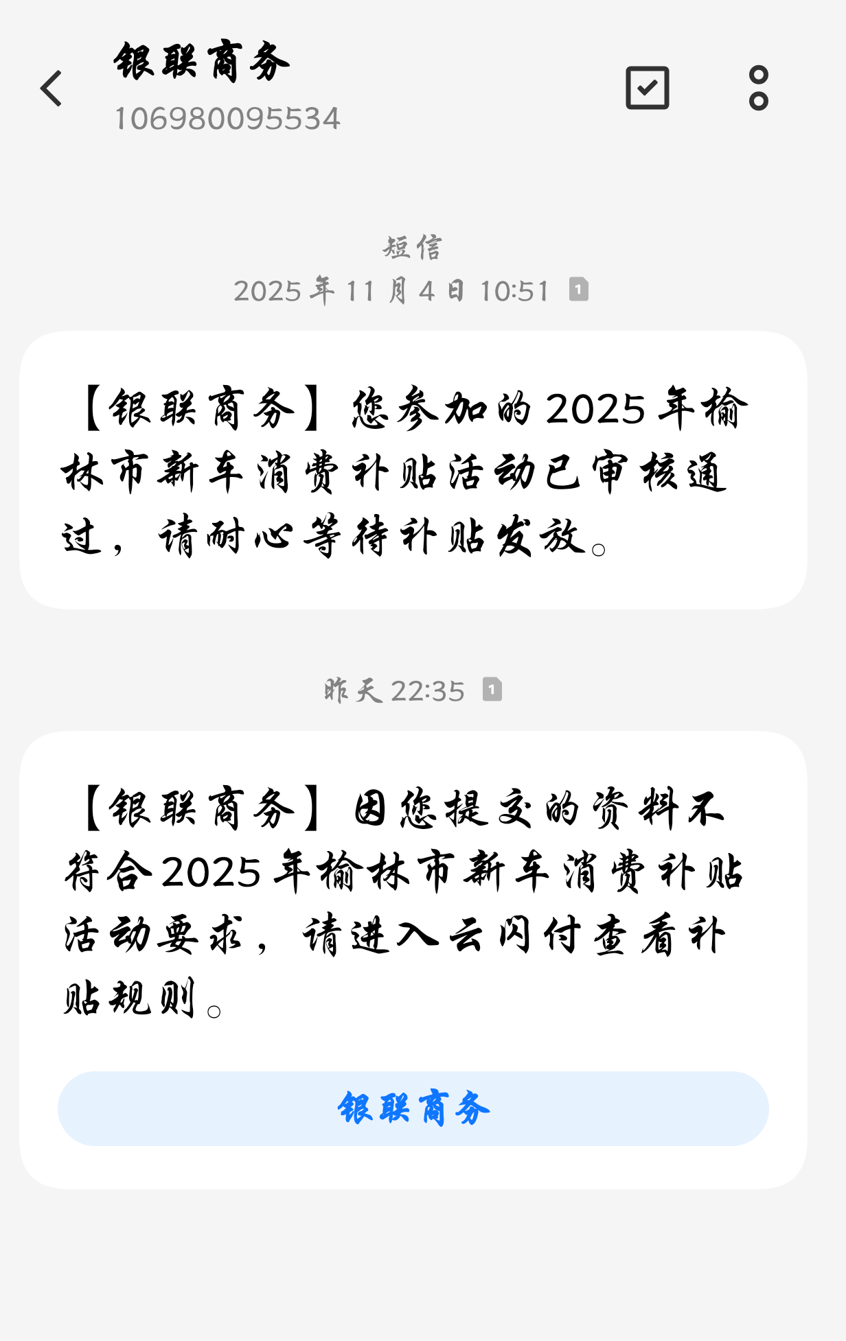 我于2025年11月2日置换的东风奕派008,11月4日收到短信,告知我补贴申请已通过审核,2026年1月19日又收到短信,告知我提交的资料不符合要求,这是怎么回事?
