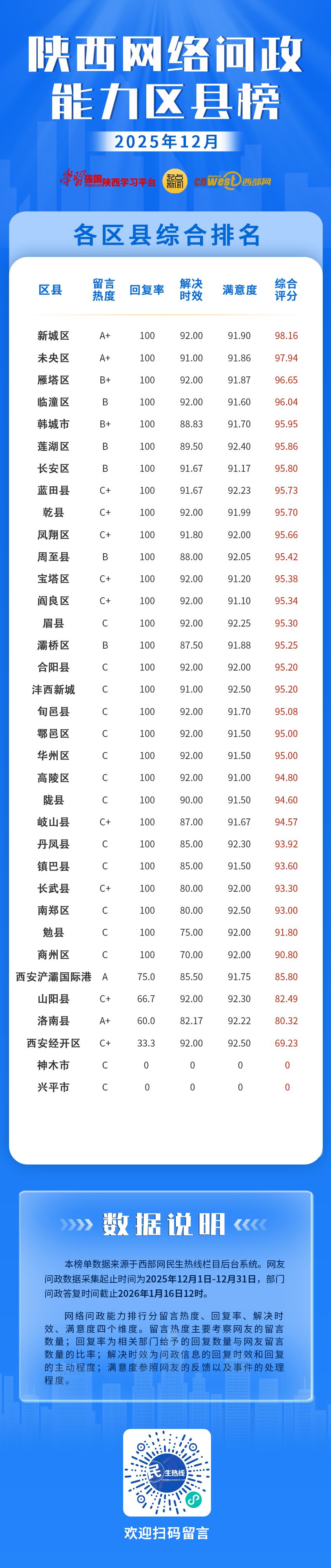 2025年12月,西部网民生热线与陕西35个区县(开发区)进行了网络问政沟通对接。根据各区县(开发区)留言热度、回复情况和网友满意度的综合评定,西安新城区、西安未央区、西安雁塔区分别以总分98.16、97.94、96.65位列网络问政能力12月区县榜前三名。