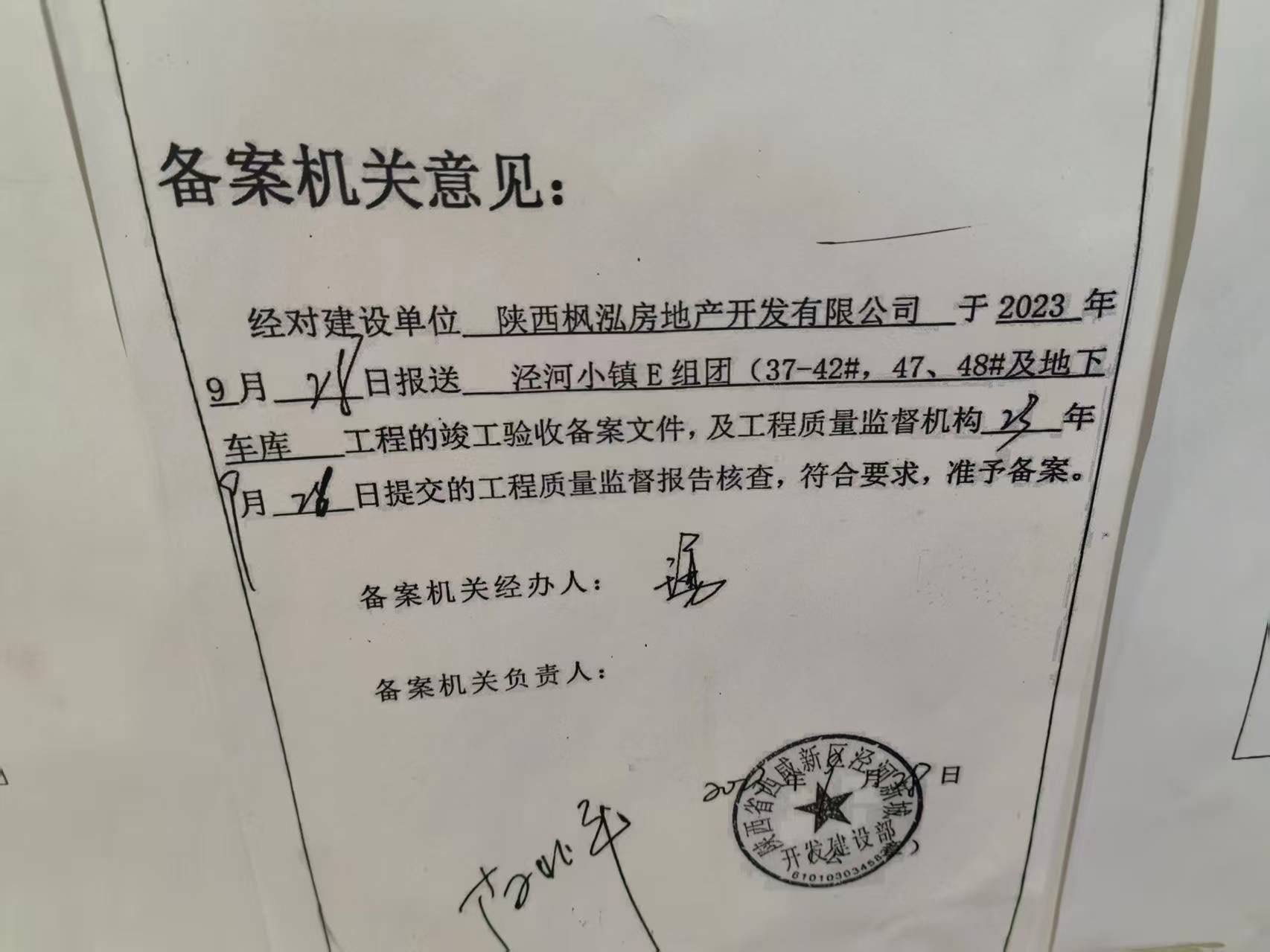 2. 通过验收:泾河新城开发建设部在明知地库电路不满足上述文件要求的情况下,仍出具《竣工验收备案表》,使项目得以交付销售。