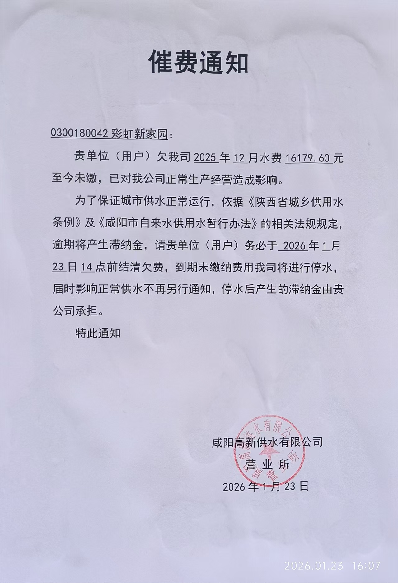 咸阳彩虹物业公司疑似未与彩虹新家园小区签订合同,强行上涨物业费,拖欠供水公司水费,小区即将停水。业主同意交水费,但被告知不能只收水费,必须捆绑物业费。