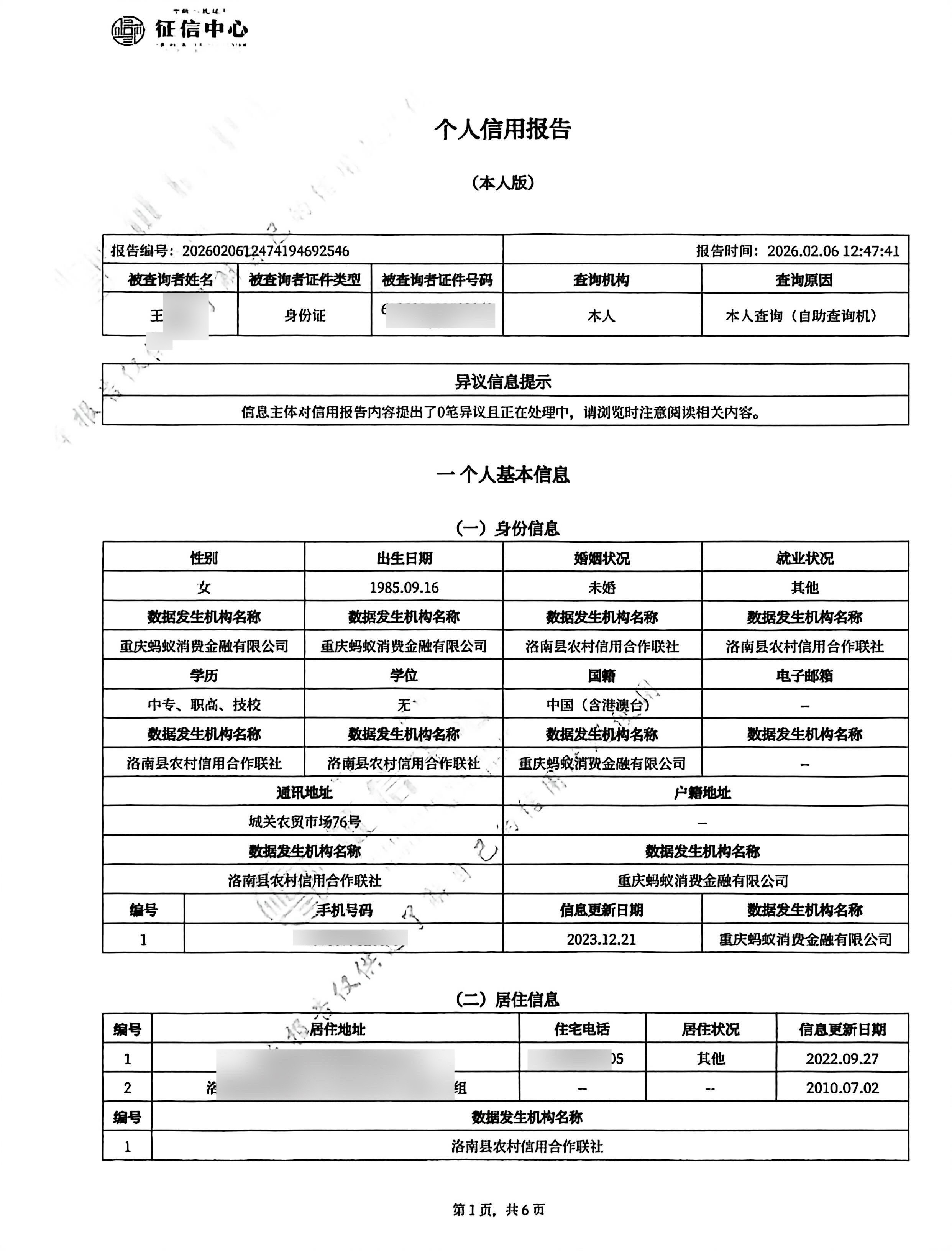 2026年2月7日我提交征信异议,洛南联社已确认是他们系统录入错误,非我本人办理,也说已上报处理。