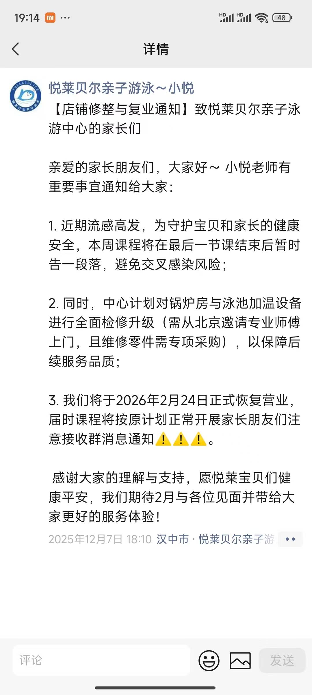 汉中市悦莱智力开发有限公司经营的汉中悦莱贝尔亲子游泳中心自2025年12月停课以来,以各种理由延迟开课时间,至今已无法正常经营,小孩报名买了30多节课,只上了几次课就停课至今,剩余课时合计2985.1元,但现在无法上课也无法退费!
