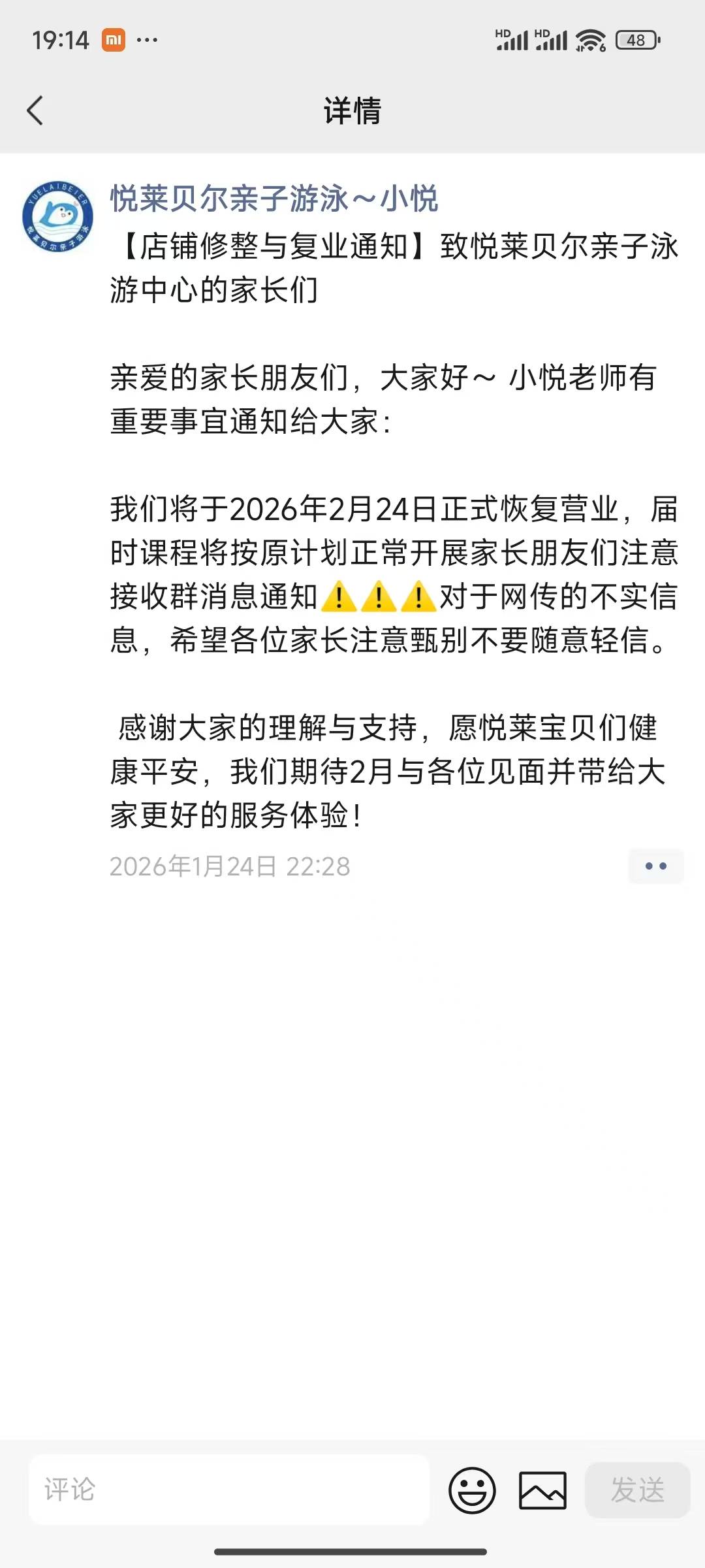 汉中悦莱贝尔亲子游泳中心停课数月 近三千元课时费不退还
