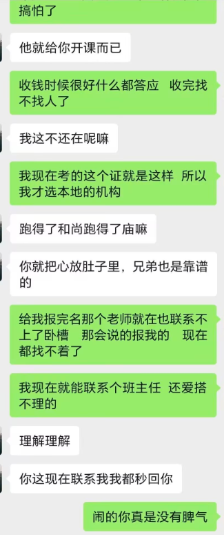 我当初怕被骗还拿信用卡办理了分期,在我办理分期之内我还是能够联系到杜老师,报完名交完钱之后,他又给我推荐一个班主任企业微信号,我看到是西安的机构,我还问他为什么不是内蒙古的,他给我解释说是这是他们下属的培训机构,我说我报名的是内蒙古的机构,他说这个不是重点,重点是不耽误我拿证就可以了。