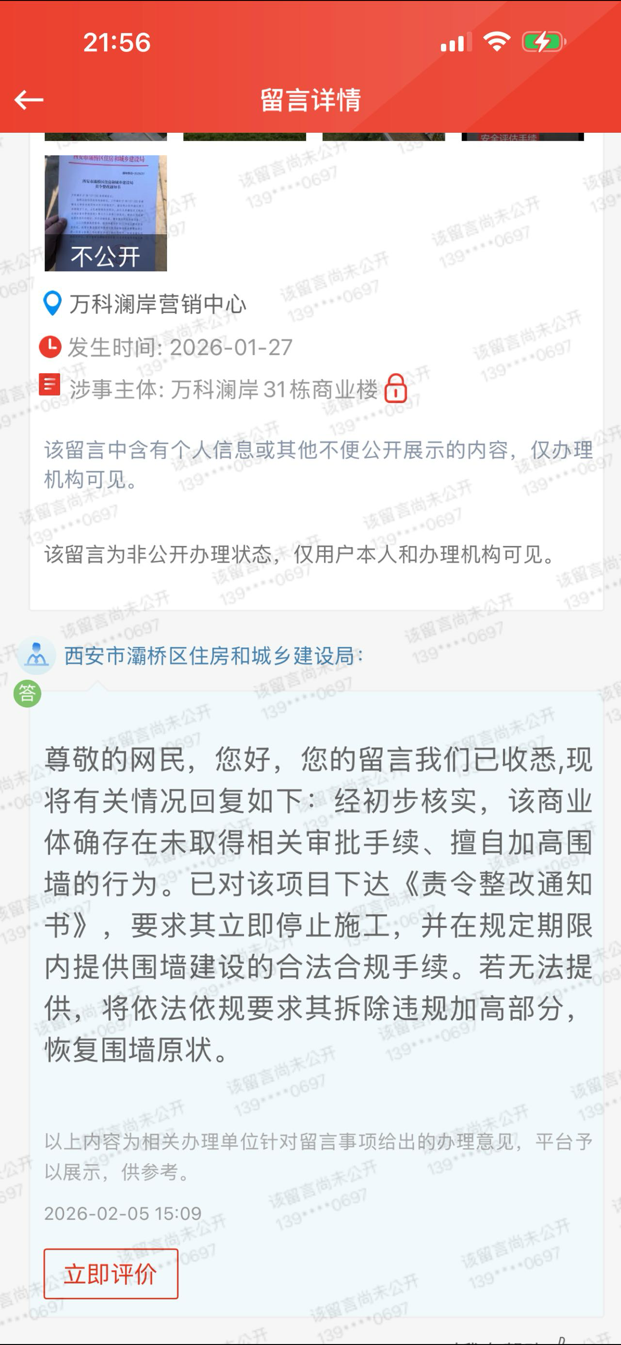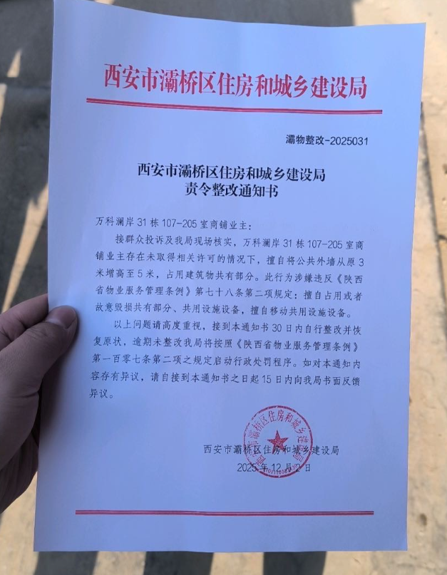 • 业主多次向浐灞城管、自规局,灞桥住建局,小区物业投诉,部门推诿也曾下达责令整改通知书,但违建仍持续施工。