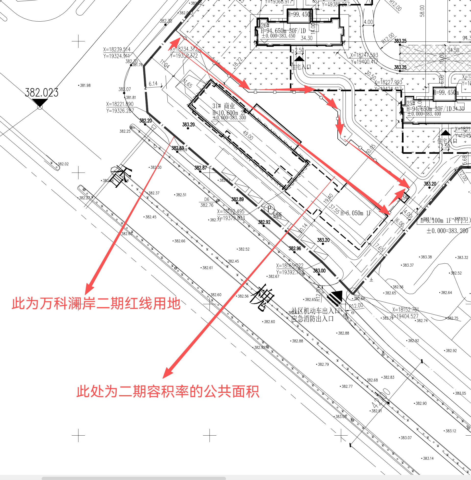 1. 红线范围清晰:总平图明确标注,31#商业北侧、东侧区域为小区建设用地红线内、31#商业建筑占地范围外的公共区域,并非商业建筑的专属用地。