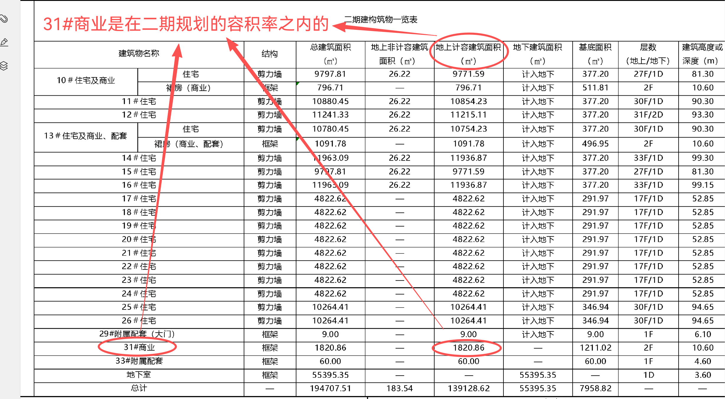 1. 容积率归属明确:从二期建构物一览表可见,31#商业的地上计容建筑面积为1820.86㎡,已全部计入二期整体容积率(总计地上计容面积139128.62㎡),其建筑占地之外的区域不属于底商私有,而是纳入小区二期的公共区域范围。