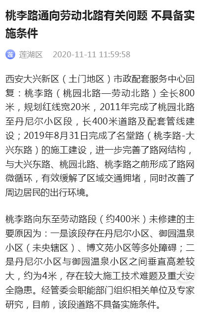 想了解一下,自2020年莲湖区有关部门回复“该路段不具备施工条件”已经过去6年,该路段后期是什么规划?一直保持断头路吗?目前百益雅苑北区的楼下一到晚上停满车,去往大兴医院或大兴新区小区需要绕行很大一圈,很不方便。