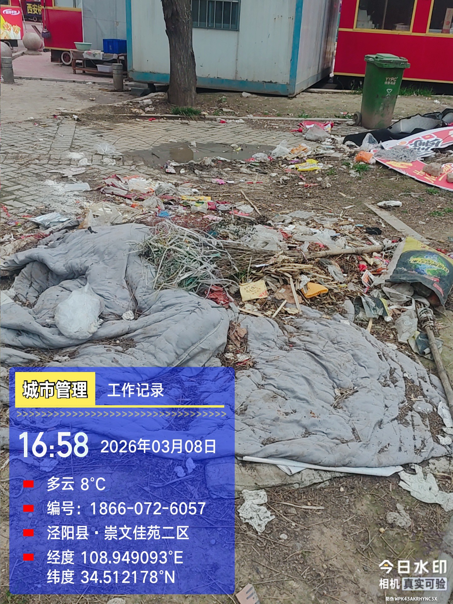 本人于3月9日反映泾阳县正阳大道1165号崇文佳苑二区附近(园区外公共区域)暴露垃圾问题,并上传了年3月8日16:58拍摄的现场照片为证,清晰显示垃圾、废弃被褥等杂物堆积,证据确凿,但承办单位先后作出与事实不符的回复。