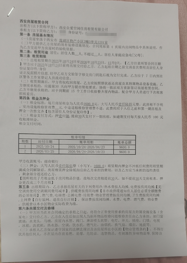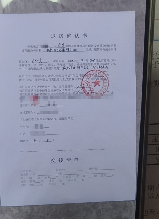 2025年10月,本人通过莲湖区丰庆路39号御溪望城6号楼西门1单元20102室西安众爱空间住房租赁有限公司,在莲湖区西斜一路3号物产小区2号楼三单元1201室租赁房子,房子2026年10月到期,已经将房租支付了半年(2025年10月-2026年4月),但是中介公司未按时给房东支付2025年10月-2026年4月的房租,房东不让我正常入住,剩余6个月的房租6803元未退还给我,2025年11月份协商等2026年3月份给退还6803元房租,目前无法联系到该中介公司退费,至今无人处理。 希望尽快退费, 望相关部门核实处理。