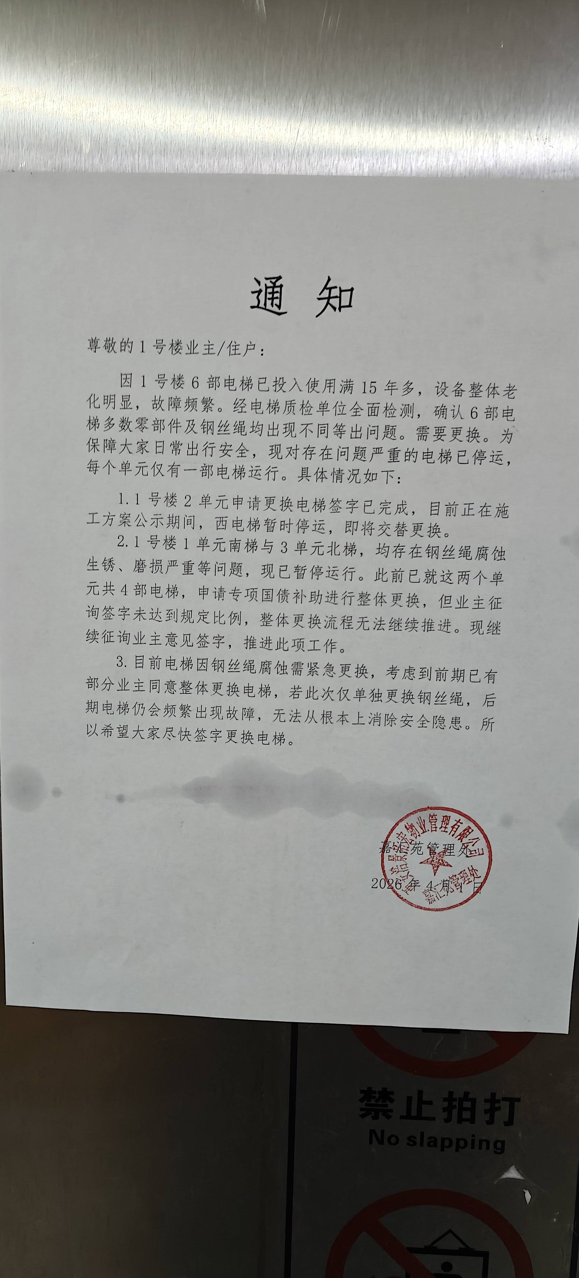 西安未央区嘉汇苑小区物业以电梯钢索老化,业主不同意更换新电梯为由,擅自停运1号楼一单元南侧电梯,导致1号楼一单元208户业主出行不便,怀疑物业有以更换电梯为由套取大修基金嫌疑,我们要求物业及时更换电梯配件,保障业主正常出行,不得随意停运电梯。