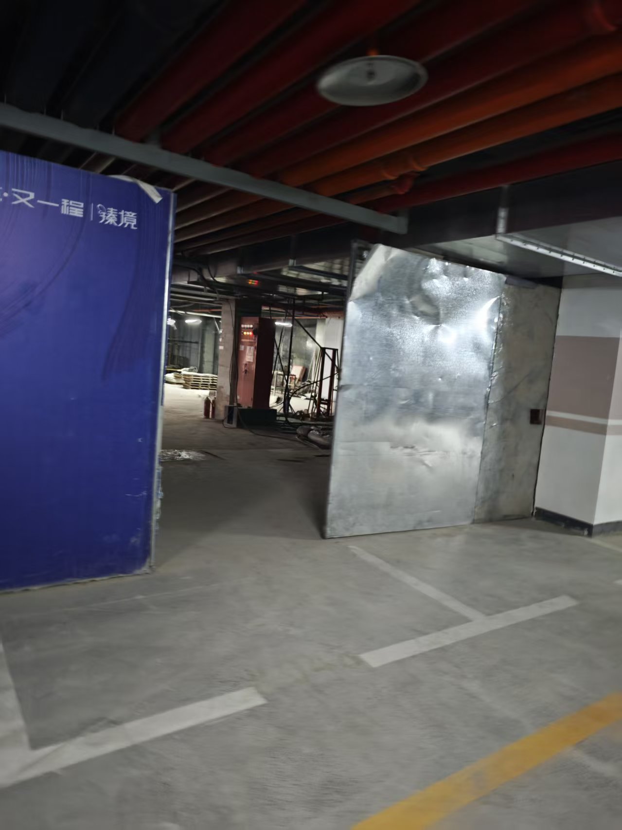隔离设施不合规:施工区与已交付车库未按规范设置防火、稳固的隔离设施,仅用薄铁皮围栏,不具备防火性能,结构不稳定,不符合建筑安全及消防要求。