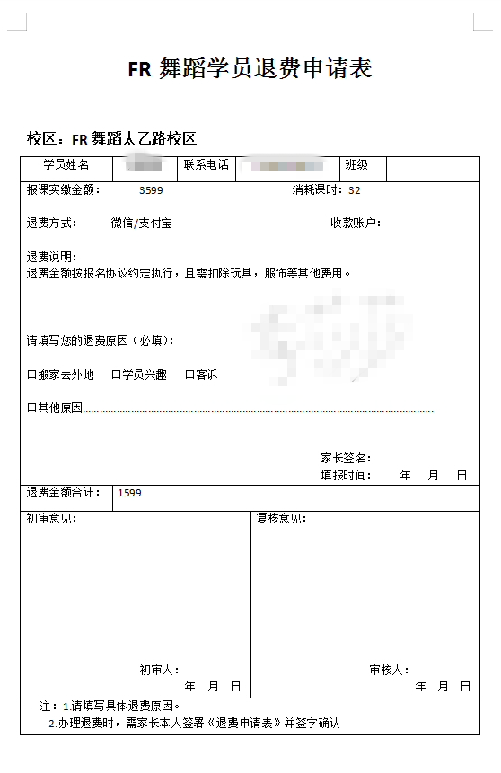 孩子在西安市碑林区太乙路皇嘉广场FRFANCE舞蹈培训机构学习舞蹈,因机构更换老师、搬迁新校区等均未事先通知家长,我们决定不在该机构继续学习,要求全额退还剩下的费用。通过相关部门协调,机构同意退费,我也配合签了机构要求签署的退费申请表,然后就一直推脱,微信不回复,也联系不上。相关部门称:该机构已关闭。但我能看到群里通知依然在上课。现希望机构按照承诺退回1599元费用。