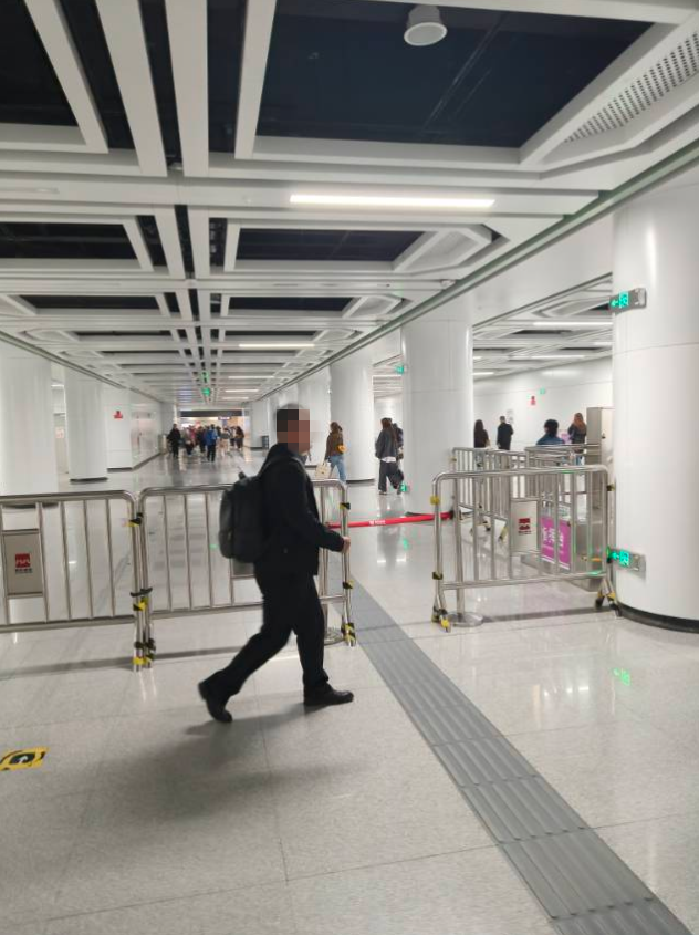 广泰门站的分流围挡阻断了原本连续的盲道,未设置任何绕行引导盲道,盲人乘客完全无法通过触觉感知安全通行路径,极易误撞围挡、迷失方向,发生摔倒、磕碰等安全事故。同时,分流区域的关键节点未补充盲文导向标识、无障碍语音提示严重缺失,原本的盲道系统被彻底破坏,让视障乘客彻底失去了独立出行的“安全生命线”。