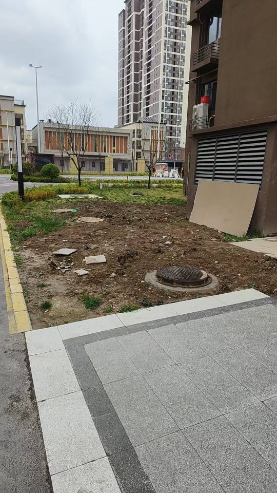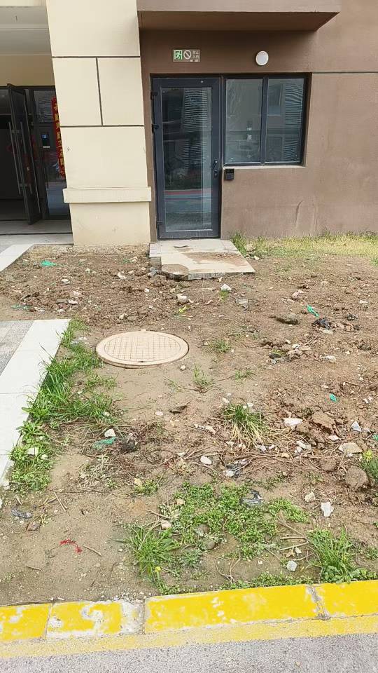 2、单元楼门口绿化拖了半年多不复种,黄土裸露,大风天气风沙满天飞;