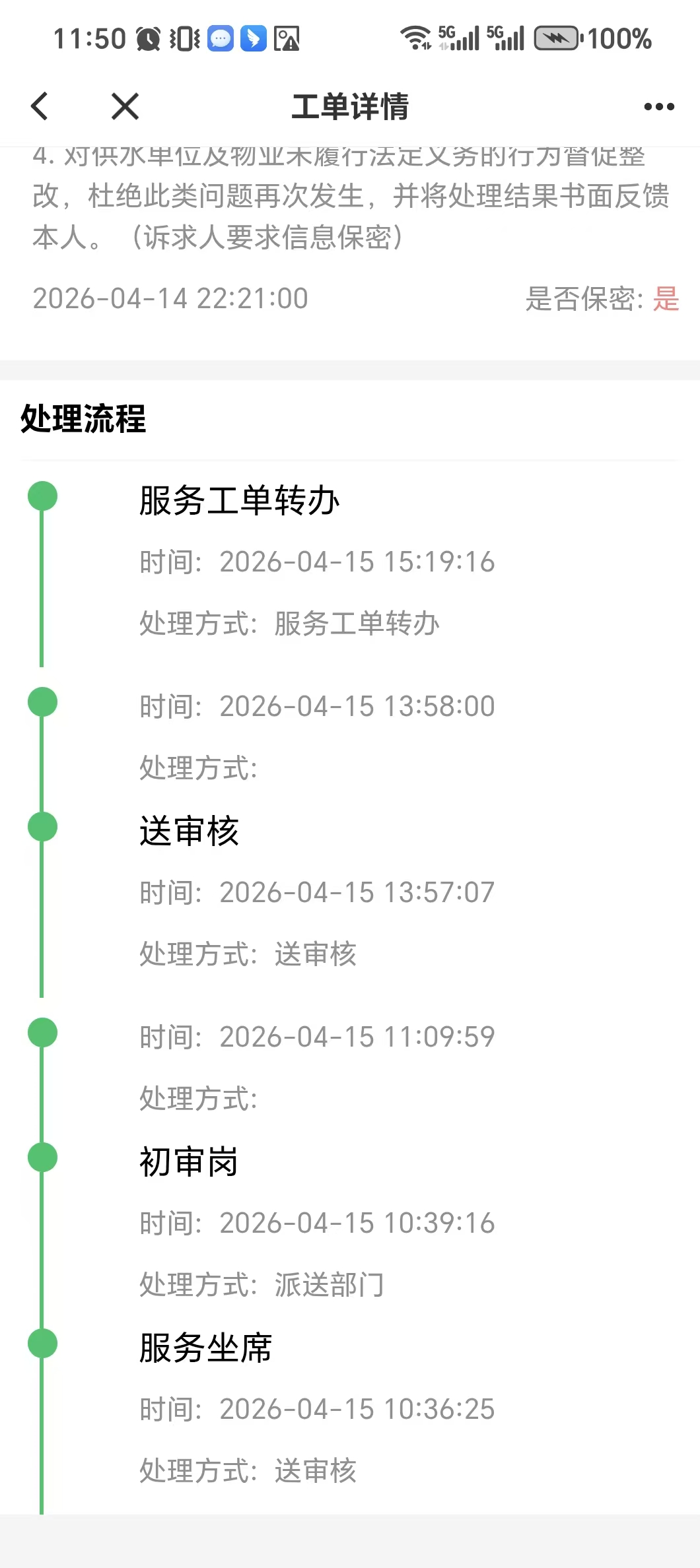 3. 督促物业与供水公司限期整改,并将处理结果向本人反馈。