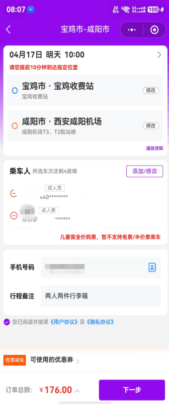 4月17日10点,我乘坐咸阳宏图运输集团有限公司(以下简称宏图公司)定制客运陕U698XB,从宝鸡去咸阳机场去,前期在微信小程序“宏图出行”已购票,两人共176元。按在宝鸡钛谷大桥南公交站刚上车,车辆未进宝鸡高速口就报故障,司机让我们8位乘客在虢镇收费站出口下车,我们在烈日下等待从宝鸡南站10点30分发车非定制大巴陕D98881赶往机场,收费60.5元。