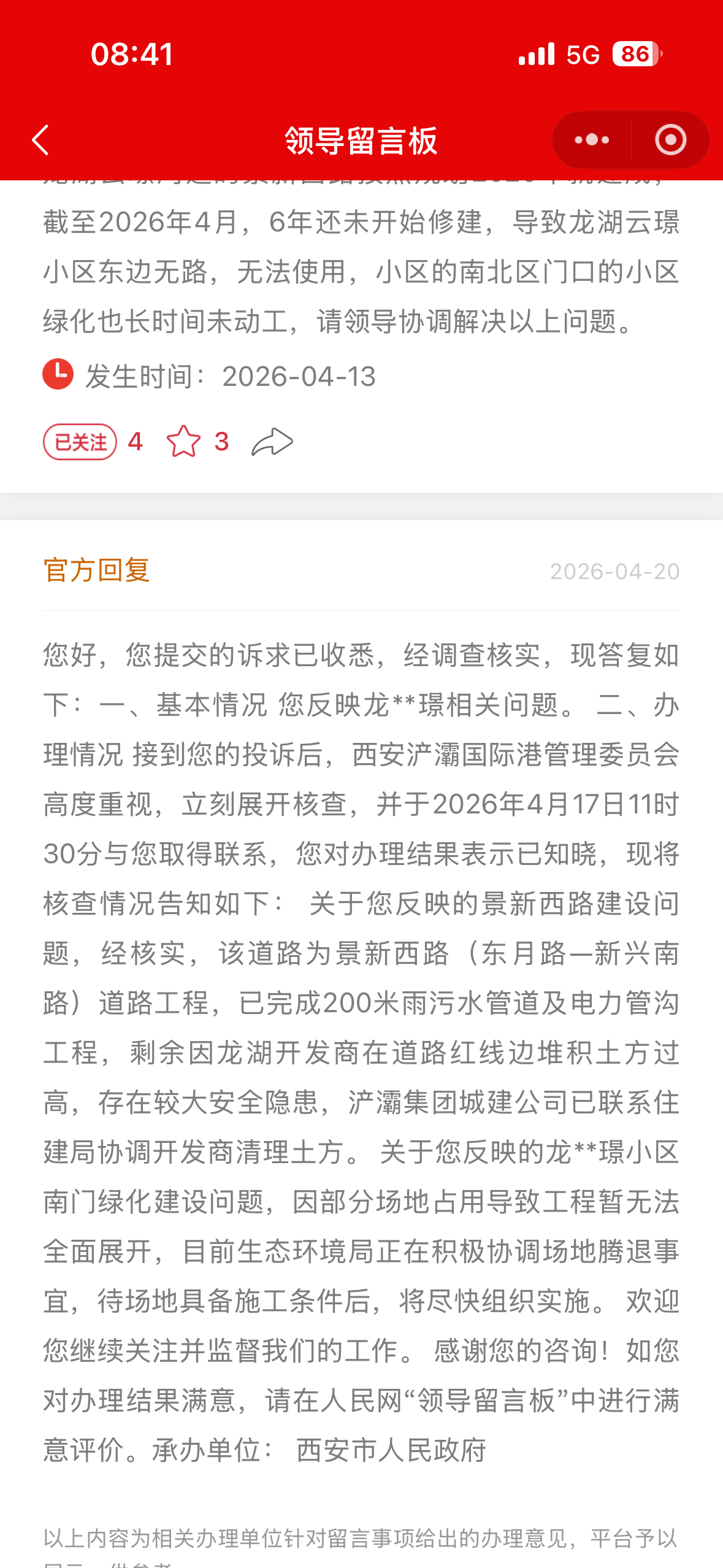 管委会曾与业主代表协商,明确承诺2024年12月前进场施工、彻底修通道路,但到期后毫无进展。业主多次督促,相关部门始前期称是地产遗留土堆问题;现土堆已清理至红线外,仍以相同借口敷衍,无任何推进。2024年仅短暂施工部分下水管道,随后便长期停工。业主通过12345等多渠道投诉,均被层层转办,问题持续搁置。经多方了解,项目停滞原因疑似资金未落实或被挪用。