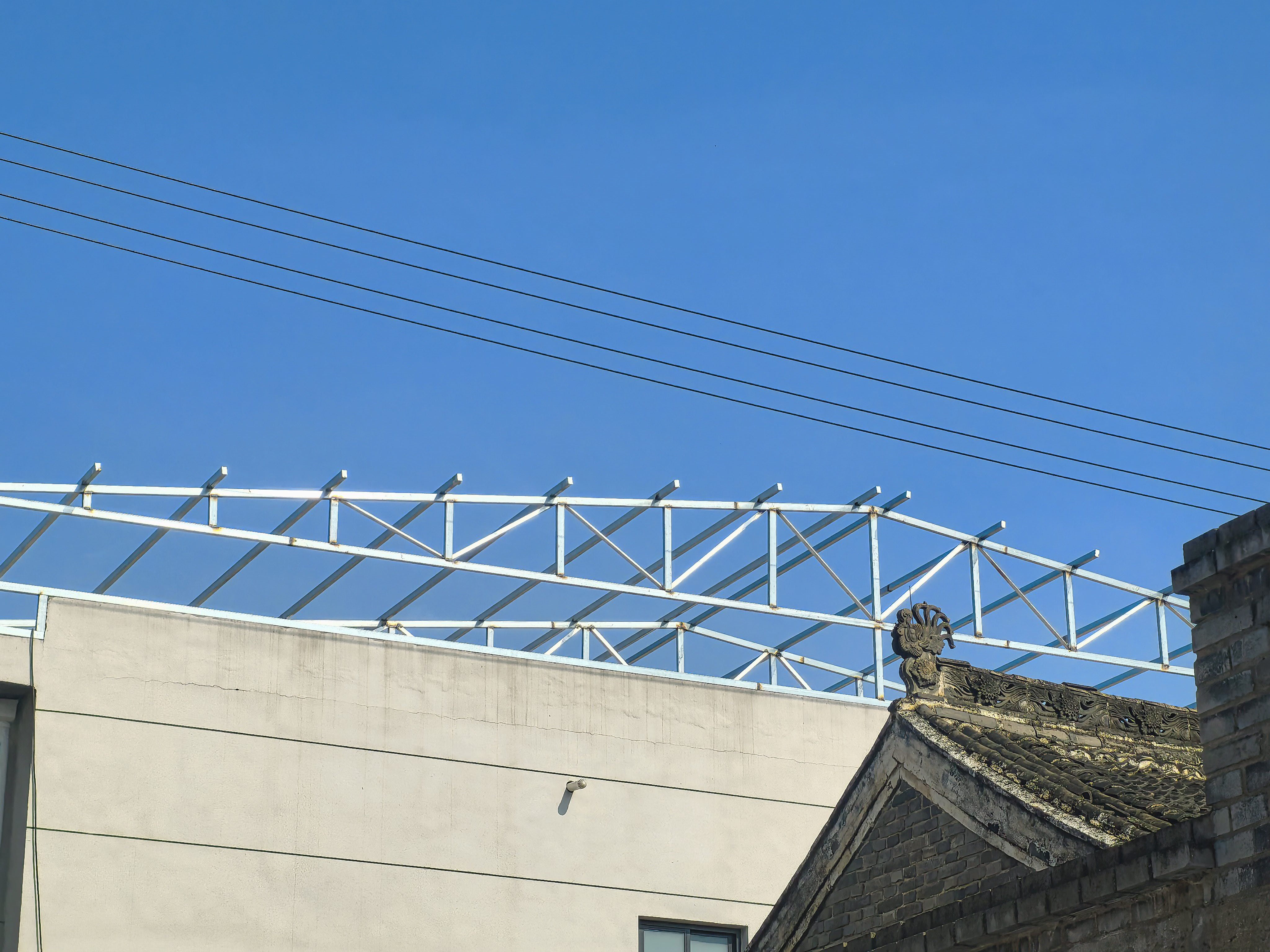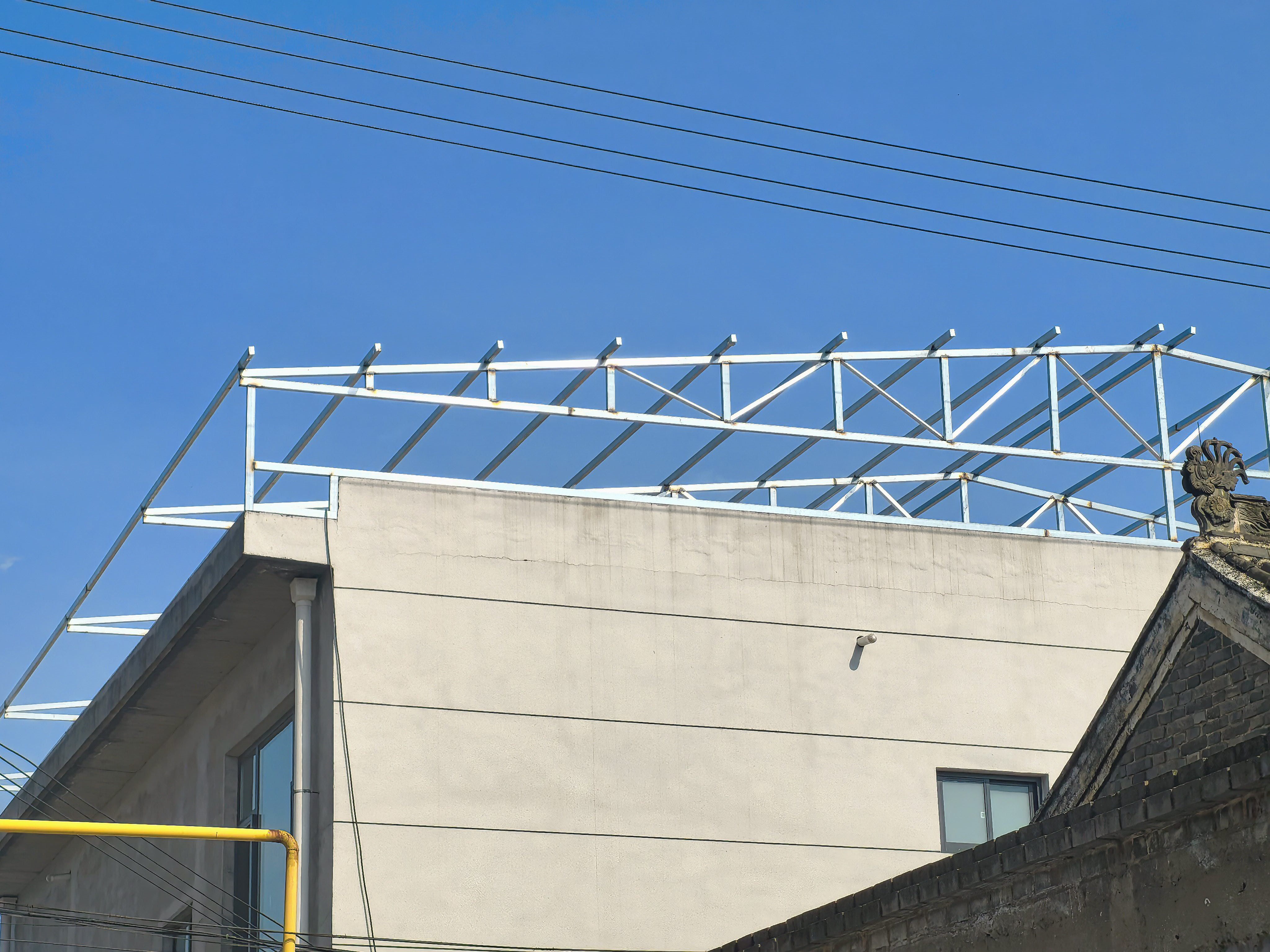 4月22日韩城市重阳村六组一户村民在原有房屋屋顶上,私自搭建钢结构框架,属于“楼顶加建构筑物”。这类钢架棚普遍存在抗风、防雷、消防等安全问题;未取得规划许可;擅自改变建筑结构和高度,违反《城乡规划法》;严重影响相邻建筑物的采光;易燃建筑材料存在消防隐患。