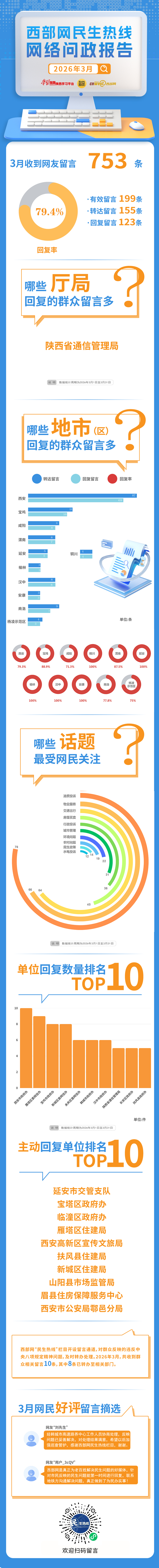 2026年3月,西部网民生热线收到网友留言753条,其中符合受理条件的网友留言199条。栏目组向陕西省、市、县(区)各有关部门单位转办155条网友留言,其中123条留言已办结回复,整体回复率为79.4%。