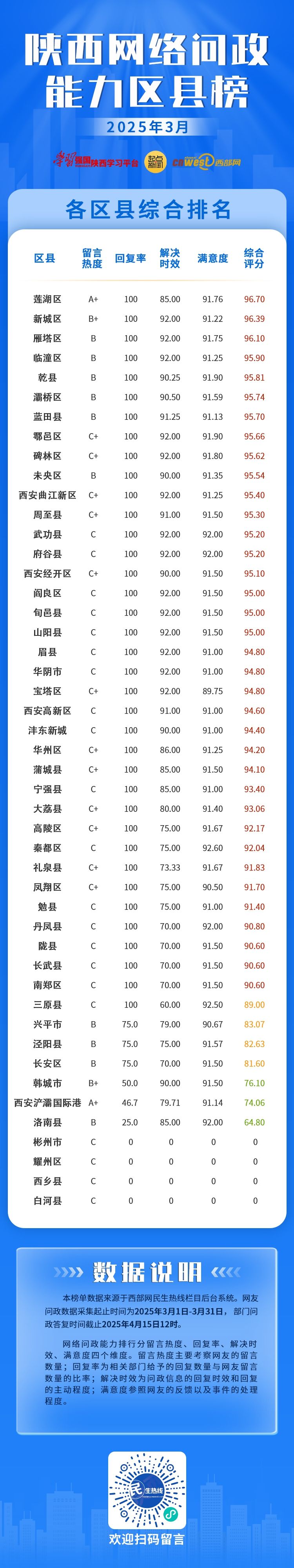 2025年3月,西部网民生热线与陕西47个区县(开发区)进行了网络问政沟通对接。根据各区县(开发区)留言热度、回复情况和网友满意度的综合评定,西安莲湖区、西安新城区、西安雁塔区分别以总分96.70、96.39、96.10位列网络问政能力3月区县榜前三名。