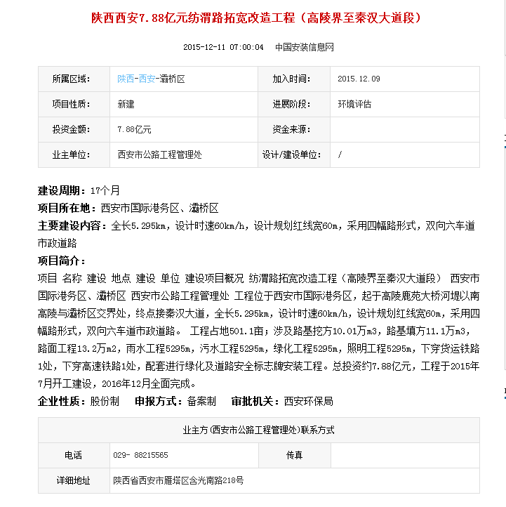 项目概况:纺渭路拓宽改造工程(高陵界至秦汉大道段)位于西安市国际港务区,起于高陵鹿苑大桥河堤以南高陵县与灞桥区交界处,途径纺渭路,终点接秦汉大道,全长5.295km,设计时速60km/h,设计规划红线宽60m,采用四幅路形式,双向六车道市政道路。总投资约7.88亿元,计划2014年10月开工建设,2015年5月31日前完成主车道建设,10月底前全面完成。