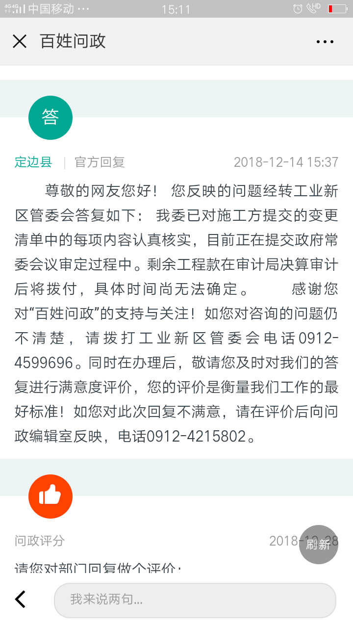 尊敬的领导,生活逼迫,实在没有办法我想到了您,2018年定边县称对定莲路竣工验收,时隔一年有余,现在还是没有结果,我从2018年6月份开始每个月都在榆林百姓问政平台咨询一次此事,时至今日百姓问政平台回复是定边县新区在积极处理此事,我不知道我能等到那个时候吗,不知道什么时候定边县给我们结清工程款?