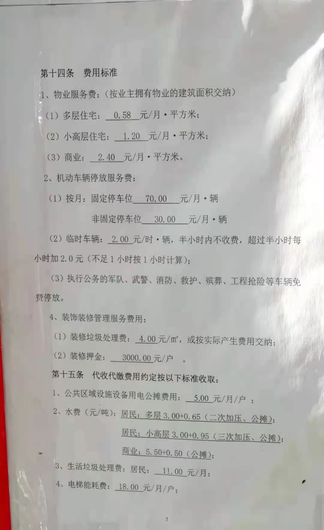 事件基本情况:2020年12月某天我们发现小区张贴物业费涨价的公示,多层住宅0.58元/月.平方米,小高层住宅1.20元/月.平方米,商业2.4元/月.平方米,固定停车位70元/月辆,非固定停车位30元/月辆,临时停车位2元/小时辆,装修垃圾处理4元/平方米,装修押金3000元,公摊电费5元/月户,水费多层3.00+0.65/t(二次加压、公摊),小高层住宅3.00+0.95/t(二次加压、公摊),商业5.00+0.50/t(二次加压、公摊),生活垃圾居民11.00元/月,电梯费用18元/月户。